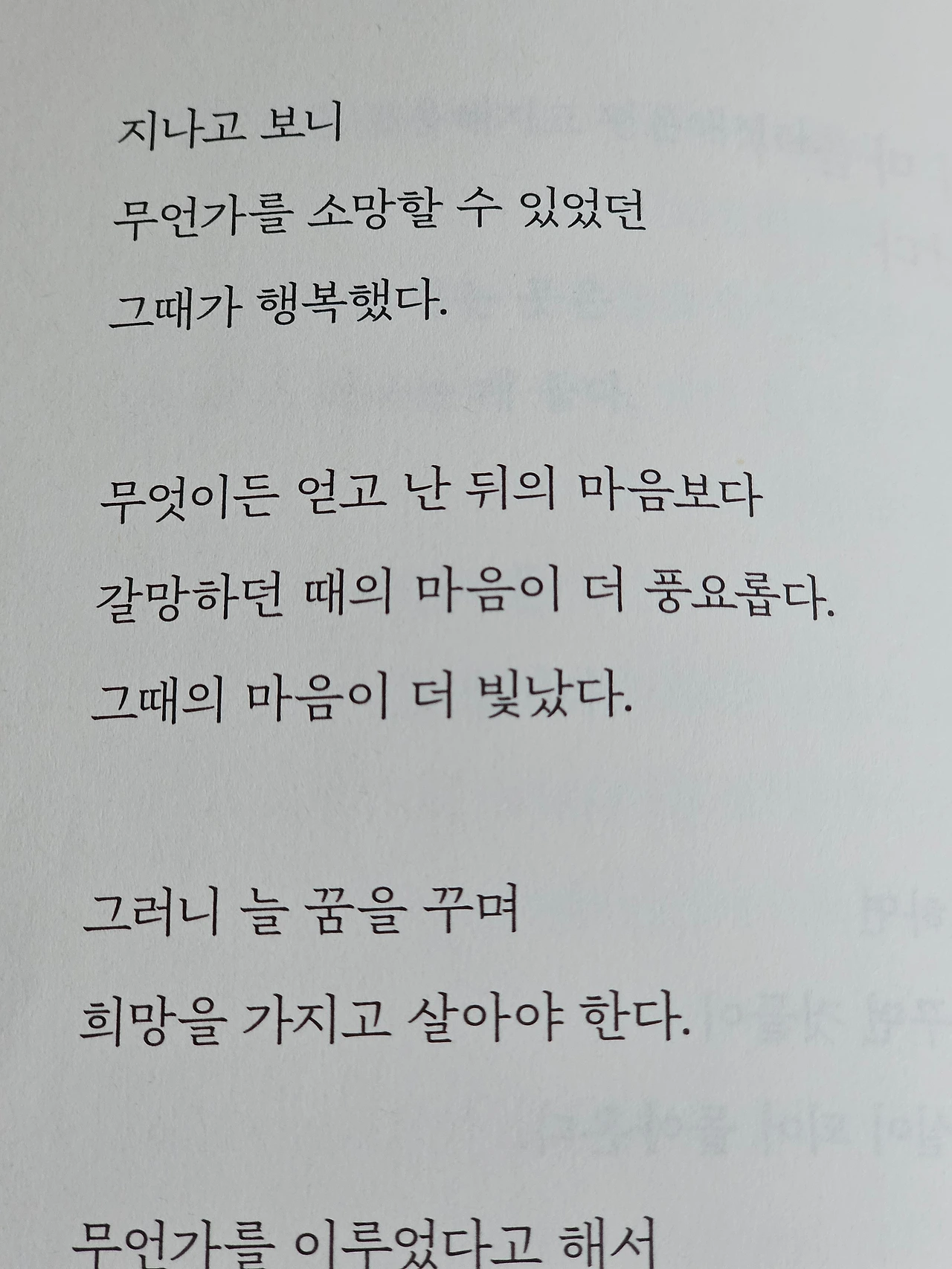 잠시 짬을 내어 도서관에서 빌려온 책을 읽었다. 이미 전에 읽었던 책이지만, 한 번 더 빌려온 책. 설렁설렁 읽다 보니 마음에 꽂히는 구절이 있었다. '무엇이든 얻고 난 뒤의 마음보다 갈망하던 마음이 더 풍요롭다. 그때의 마음이 더 빛났다'는 말.
