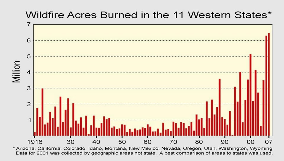 2016 - 2007 (2008년 엘로우스톤 국립공원 산불 기념학회 (Much))이 그림은 2008년 Much가 발표한 자료로, 미 서부 11개 주에서 산불에 탄 면적을 보여주고 있습니다. 1945년 2차 세계대전이 끝난 후, 전쟁에서 사용되던 물자가 산불방제에 사용되면서 산불이 크게 감소한 것을 보실 수 있습니다. 하지만 1980년경부터 이러한 노력에도 불구하고, 또한 실제로 산불방제에 더 많은 돈이 들어갔음에도 불구하고 산불은 오히려 더 많이 나는 것을 보실 수 있습니다. 지구 기상변화의 영향이라고 설명을 할 수도 있겠지만 어쨌든 산불 방제에도 불구하고 산불은 더 커지는 것을 볼 수 있습니다. 이날 학회에서 산불 방제에 들어가는 돈과 산불의 면적이 정비례한다면서 이제 산불에 돈을 더 적게 들여야 산불이 적어지는 것이 아니냐고 농담했던 것이 10년이 지난 지금도 생생히 기억납니다.