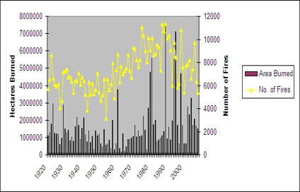 1920 - 2007 (Stocks, 2008)이 그림은 캐나다의 자료입니다. 마찬가지로 산불방재에 계속해서 노력을 하고 더 많은 예산을 썼음에도 불구하고, 산불의 숫자는 증가하는 패턴을 보실 수 있습니다. 또한 근래에 매우 넓은 면적의 숲이 탄 해가 과거보다 많고 그러한 대형 산불이 날 경우, 불에 탄 면적이 과거(1920-1950)에 비해 2배 이상임을 쉽게 보실 수 있습니다. 이는 산불의 대형화의 증거이고, 현대의 산불 발재가 대규모 산불을 막지 못하고 있음을 보여줍니다.