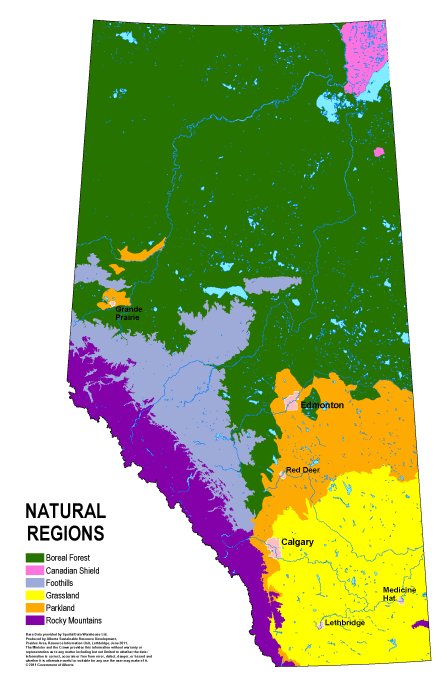 저는 앨버타주의 에드몬튼(Edmonton)이라고 곳에 살고 있습니다. 검은색으로 글자가 쓰여 잘 보이시지 않겠지만, 아래 지도에 핑크색으로 칠해져 있는 중간쯤에 위치한 도시이고, 이 주의 수도이기도 하지요. 이 도시는 과거 순록 사냥꾼들이 모여들게 되면서 물건의 거래를 위해 자연스럽게 마을이 형성되었고 이에 따라 요새가 건설되게 됨으로써 후에 이 주의 주도가 된 도시입니다. 기록에 의하면 이곳은 7개의 순록 무리가 지나다니는 교차로에 있다 보니 순록 사냥꾼들이 자연스럽게 모이게 되었다고 합니다. 이곳에 있다 보면 그 7개의 순록 무리를 자연스럽게 사냥할 수 있으니까요. 이는 아래 그림에서 보시는 바와 같이, 이곳이 냉대림 혹은 북부 한대수림이라고 불리는 Boreal forest와 목지 (parkland: 초지에 나무들이 띄엄띄엄 있거나, 키 작은 나무들이 자라는 지역)의 경계에 위치해 순록무리들이 먹을 수 있는 것도 많고 또 쉴 곳도 풍부하기 때문에 이렇게 많은 순록 무리들이 서식하고 있던 것입니다.