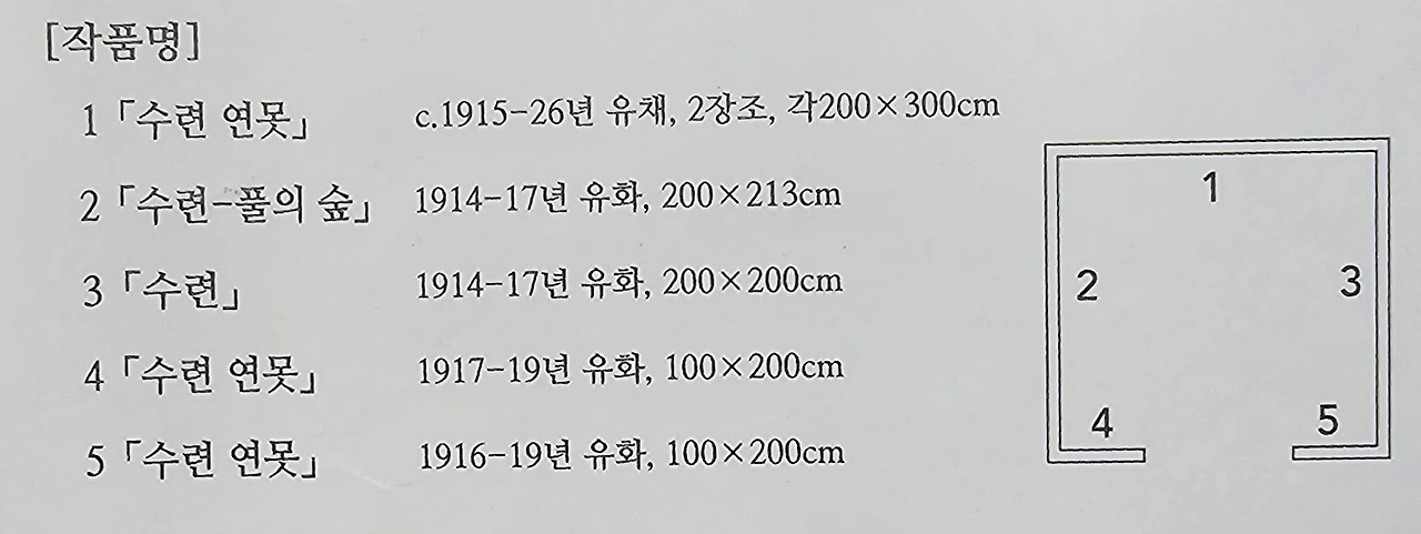 출입구가 벽을 분할하여 총 다섯 면의 벽에 수련 그림이 한 점씩 자리하고 있다.