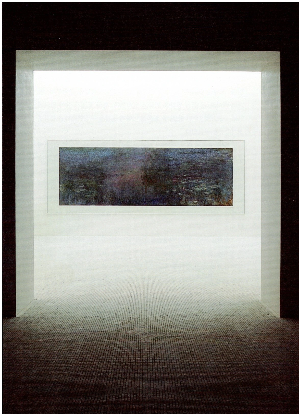 벽에 걸린 유화를 감상하기 위해 신발을 벗어야 한다는 사실이 의아하게 느껴질 수도 있겠으나 다섯 점의 수련 그림이 걸린 방으로 들어서는 순간 납득이 된다. 본당으로 가려면 여러 관문을 으레 거쳐야 하듯 이곳에서도 모네의 수련을 만나기 전, 아무것도 없는 어두운 공간을 통과한다.