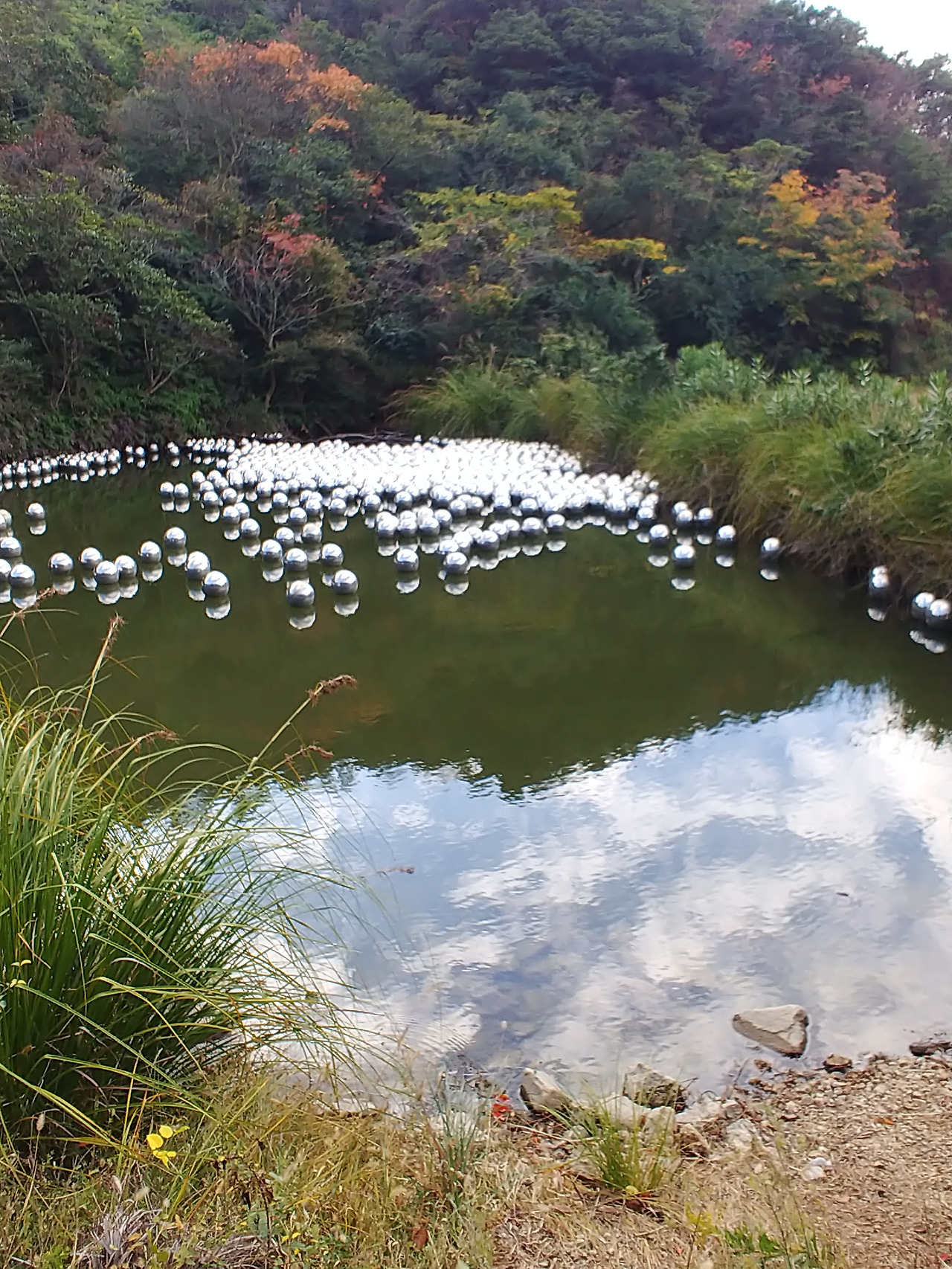 정말 88개인가, 불상의 수를 세어보는 잠깐의 순간이 오랜 시간을 들여 시코쿠 전역의 88개 사찰을 순례하는 여정의 축약본 정도 되려나. 산업폐기물 불법 투기로 자연이 오염되었던 지역에서 그 폐기물로 아름다움을 만들어 내다니. 심지어 그것이 기원의 대상인 불상이라니. 이런저런 상념을 이고 추함을 아름다움으로 탈바꿈한 불상들을 지나면 물가에 둥둥 떠다니는 은색공들이 보인다.