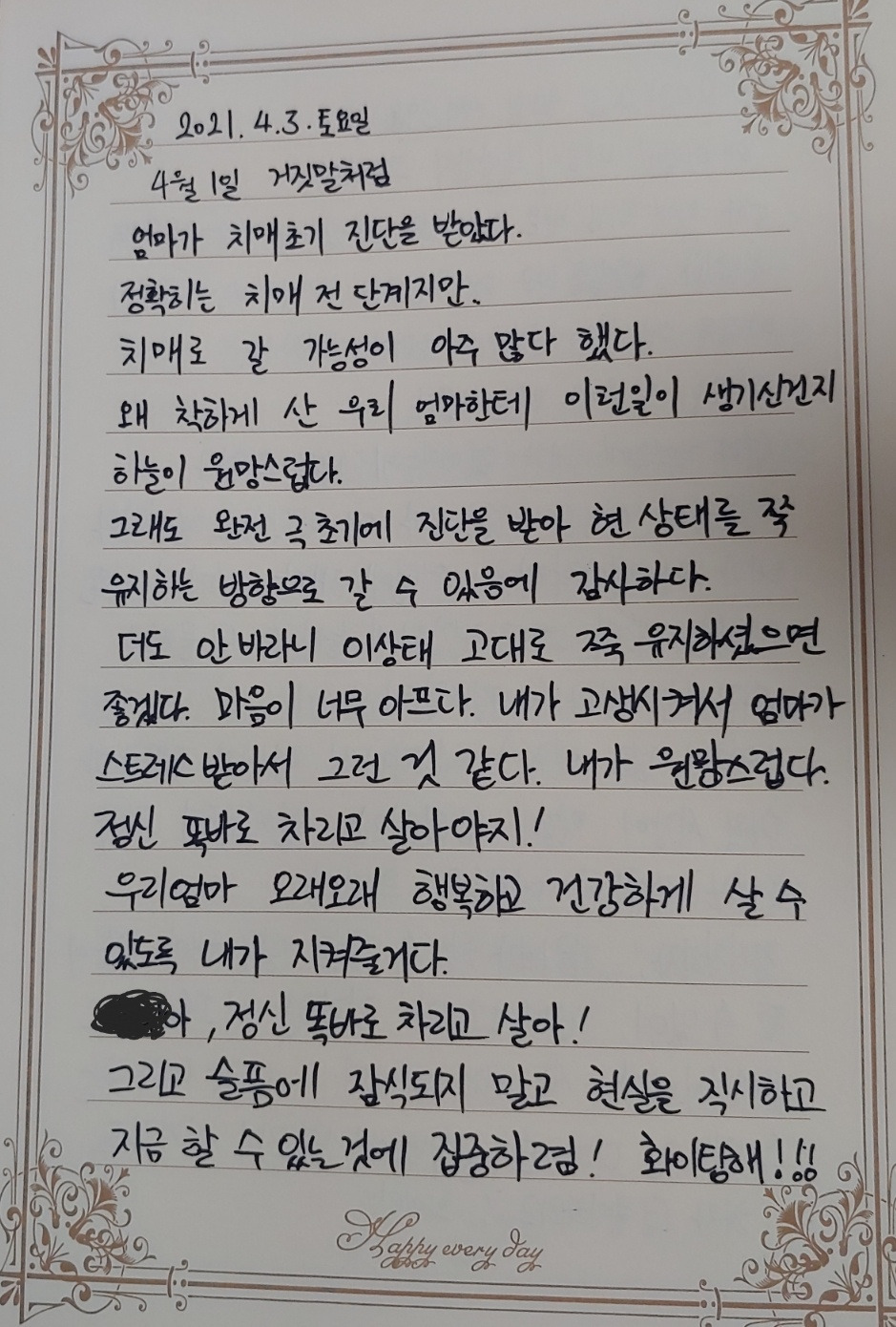 만 51세의 엄마가 처음 치매진단을 받은 후 썼던 일기다.