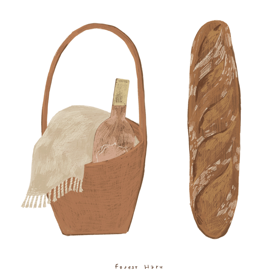로제와인은 핑크빛의 색도 예쁘지만 가볍게 즐길 수 있는 맛으로 자주 마시는 와인이에요. 잘 구워진 바게트 하나와 좋아하는 로제와인 한 병을 바구니에 담아 가까운 곳으로 피크닉을 가요.