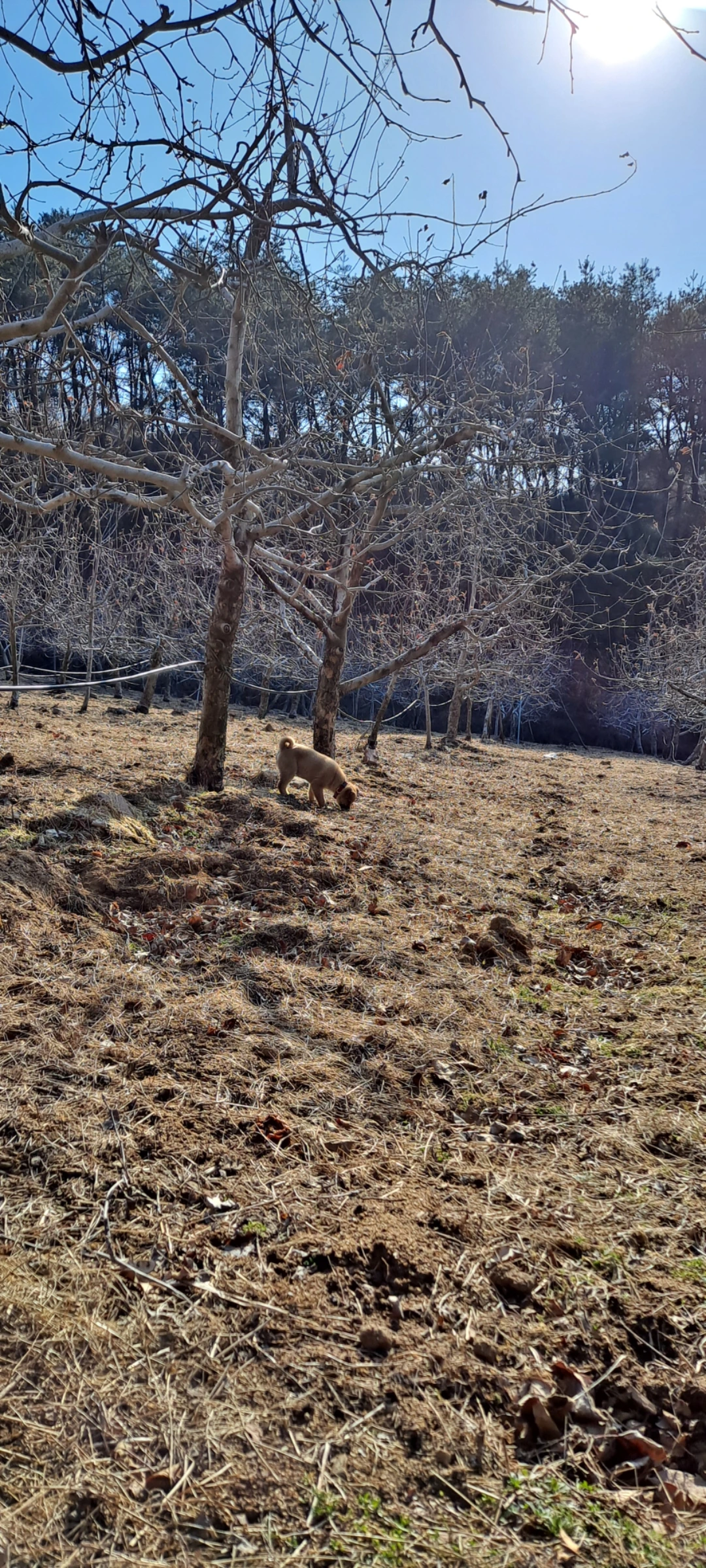 선돌마을 골짜기에서 몇 낱의 냉이를 캐고 축서사 가는 장수마을로 갔다. 읍내를 관통해 눈앞에 병풍처럼 펼쳐진 소백산 자락을 바라보며 달렸다. 해발 고도가 높을수록 사과나무 밭이 늘었고 올라간 기온에 전지 하러 나온 사람들이 보였다. 평지보다 논은 드물고 밭이 많은 동네다. 문수산에서 발원한 물길이 내성천을 이뤄 남으로 내달리는 시작점이다. 길가에 소나무와 정자가 개울을 끼고 아늑하게 쉼터를 이루고 있다. 기회 되면 텐트 갖고 와 한둔하기로 점찍어둔 곳이다. 두 여자가 미나리 하우스 초입의 콩밭에 들어가 탐색하기 시작한다. 개울에 내려가 곰돌이에게 물을 마시게 했다. 낙엽이 물 바닥에 쌓였다. 한여름에 개울물은 얼음처럼 차다. 갈증이 가신 강아지가 밭으로 뛰어가 아줌마가 던져준 냉이를 씹어 먹는다. 무엇이든 입으로 가져가는 아기나 강아지나 닮았다. 밭두렁 구석에서 졸졸 샘물 흐르는 소리가 난다. 겨우내 좀 쑤신 농부가 사다리에 올라가 똑똑 전지를 한다. 지금도 들판은 병들고 신음한다. 농사를 지어 돈을 사려면 농약과 비료, 퇴비는 필수다. 하지만 무분별한 살포와 남용은 산천을 병들게 한다. 물속의 벌레나 고기가 줄어들면 날아오는 새도 줄어든다. 예부터 연비어약(鳶飛魚躍)은 생태의 축복을 의미했다. 새가 날고 물고기가 튀어 오르는 자연은 사람도 살 수 있는 환경이다.