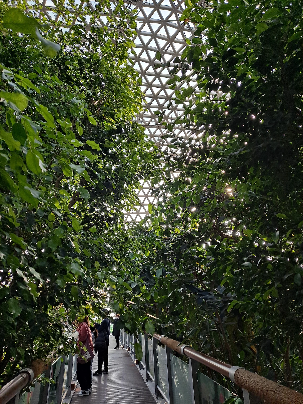 그에게 물었더니 돔 안에는 열대 식물이 있고 바깥 공간에 식물원이 있단다. 나무 이름표가 붙었느냐고 물었다. 물론 붙어 있단다. 그의 말은 사실과 달라 실망하는 데 얼마 걸리지 않았다. 복지 카드를 보여주니 무료 입장권을 내준다. 돔 입구에서부터 길목마다 안내원이 서 있다. 난 그들이 기간제 직원이라는 걸 안다. 시청 구직 공고에서 '신중년 일자리'를 보았기 때문이다. 기간제 일자리는 상 하반기로 나눈다. 많은 수의 실업자를 참여시키려는 정책이지만 구직자는 짧은 기간 일하고 다른 일자리를 찾아야 한다. 그만큼 노동의 안정은 흔들린다. 열대 식물이 인공 암벽을 따라 빼곡하게 심어졌다. 물보라를 튀기는 인공 폭포, 겨울에도 꽃을 피운 갖가지 열대 식물은 흥미로웠다. 안내원들은 비로 바닥을 쓸거나 작은 원예용 가위로 말라죽은 이파리를 잘라 봉지에 담기도 했다. 돔 식물원의 모든 곳은 정갈하게 관리되고 실내의 공기는 수목에서 뿜어내는 산소로 눅진한 청량감이 느껴졌다. 바쁜 안내원에게 사진을 부탁했다. 동굴 형태의 관람 코스를 돌아 나오니 밖의 공기가 시원하다.