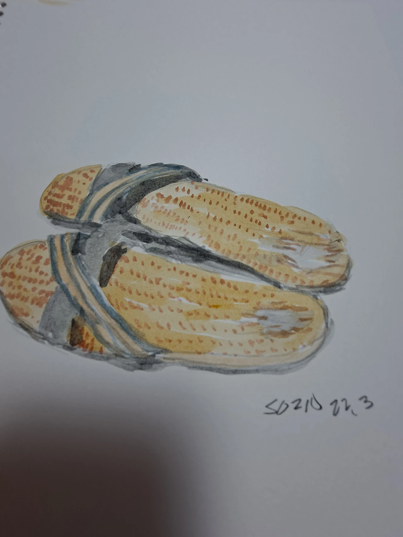 집에 돌아와 낡은 실내화를 벗어놓고 그리는데 시인에게서 전화가 왔다. 형제가 죽었다고 했다. 가슴이 서늘해졌으나 위로의 말을 찾지 못했다. 시인은 이제 자기가 집안의 어른 노릇을 해야 한다며 쓸쓸하게 웃었다. 난 만나자는 약속을 하지 말자고 했다. 정말 심심해서 죽을 지경이면 바람이나 쐬러 내려오라고 했다. 그렇게 말하니 마음이 무거웠다. 마치 영영 마지막인 것 같은 느낌이 목젖을 쓸어내렸다. 얼마나 만나고 헤어져야 삶의 끝을 보게 될까. 통화하면서 붓으로 남아시아산 마로 짠 실내화 바닥을 찍었다. 해진 실내화 바닥이 너덜한 내 모습 같다. 다행인 건 수영과 그림에 몰입하는 현재다. 물의 저항을 계속하는 것과 하얀 여백에 얼마나 물감을 찍어낼지는 알 수 없다. 홀로 밥 끓이며 독한 존재의 사슬을 부감(俯瞰)하는 것, 그것만이 할 수 있는 전부인 것 같다.