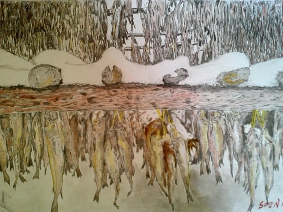 첫날 비닐 백에 스케치북 물통 팔레트와 붓을 넣어 갔다. 작년에 쫑파티를 하고 청소하지 않아 이층 화실은 지우개 가루와 먼지가 푹푹 쌓였다. 회원들이 빗자루를 잡고 청소를 시작하자 나도 멀뚱히 보고 있을 수 없어 거들었다. 대걸레를 빨아 바닥도 문댔다. 작년 회원이 십여 명이고 신입회원은 다섯이었다. 회원들은 작년에 그리다 만 그림을 손질했고 신입회원은 4B 연필 쥐는 법부터 해서 사절 스케치북에 선긋기 연습을 했다. 수평 수직 사선으로 선을 긋고 구형에 명암을 주며 그러데이션 연습을 했다. 미술 교사 출신인 육십 초반의 선생은 돌아가며 그림 코치를 해주었다. 선생이 내 비닐 백을 들여다보더니 스케치북을 꺼내 본다. 2013년 겨울에 그린 황태 덕장 그림이 나왔다. 회원들이 몰려들어 그림을 보며 탄성을 낸다. 부끄럽기도 했지만 어쩌랴 난 수채화를 배우러 왔으니 실력이 있고 없고를 떠나 기초부터 익혀야 한다.