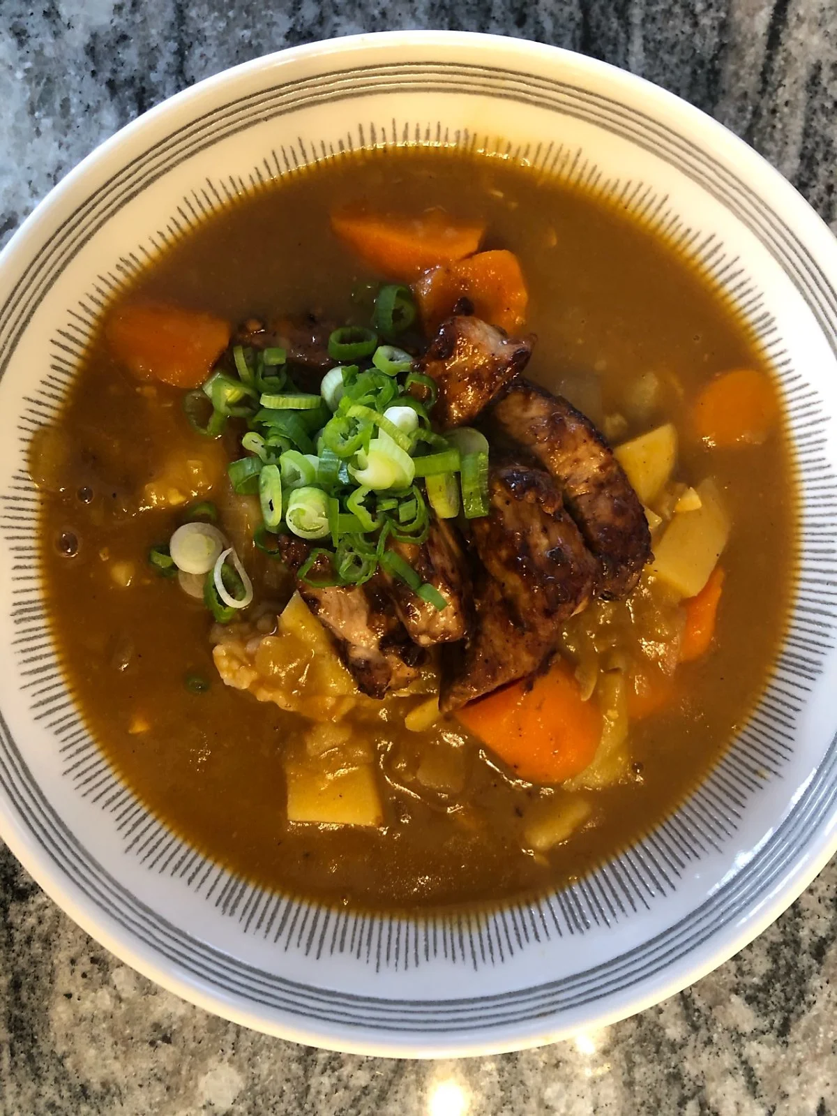 냉동실을 뒤적여 슈니츨을 만들 때 따로 떼어두었던 돼지고기 목살 두 조각을 꺼내 놓고 잠시 생각에 잠기더니, 이번엔 튀기지 말고 간장 베이스로 볶아보겠어- 라며, 센 불에 촤르르 휙휙 손목 스냅 화려하게 카레 고명용 돼지고기를 만들었다.