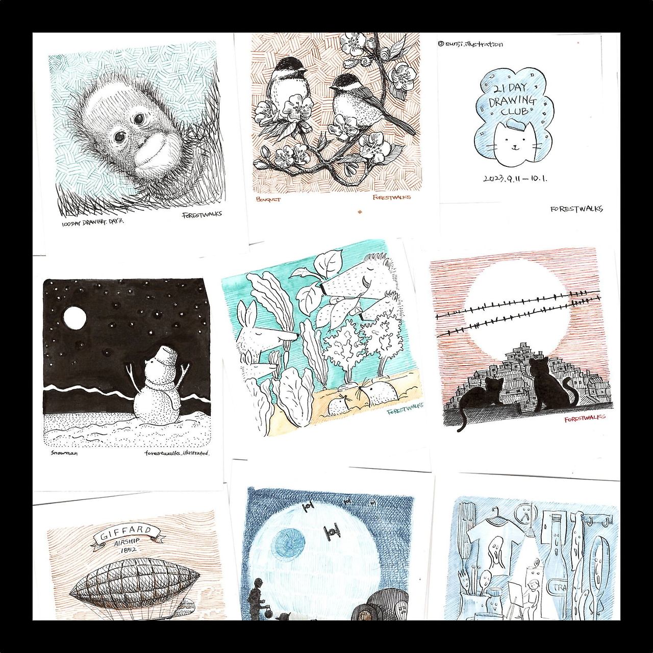 Domestika 사이트에서 Dip Pen and Ink Illustration 클래스를 들으며 그리는 재미를 발견했다. 하지만 스스로 동기부여를 할 수준은 아니었기 때문에 뭔가 적절한 압박이 필요했고, 마침 막 시작하는 드로잉 챌린지가 있어서 참여를 하게 되었다. 21일간 퇴근 후에 폴라로이드 사진 크기의 종이에 그림을 그렸다.
