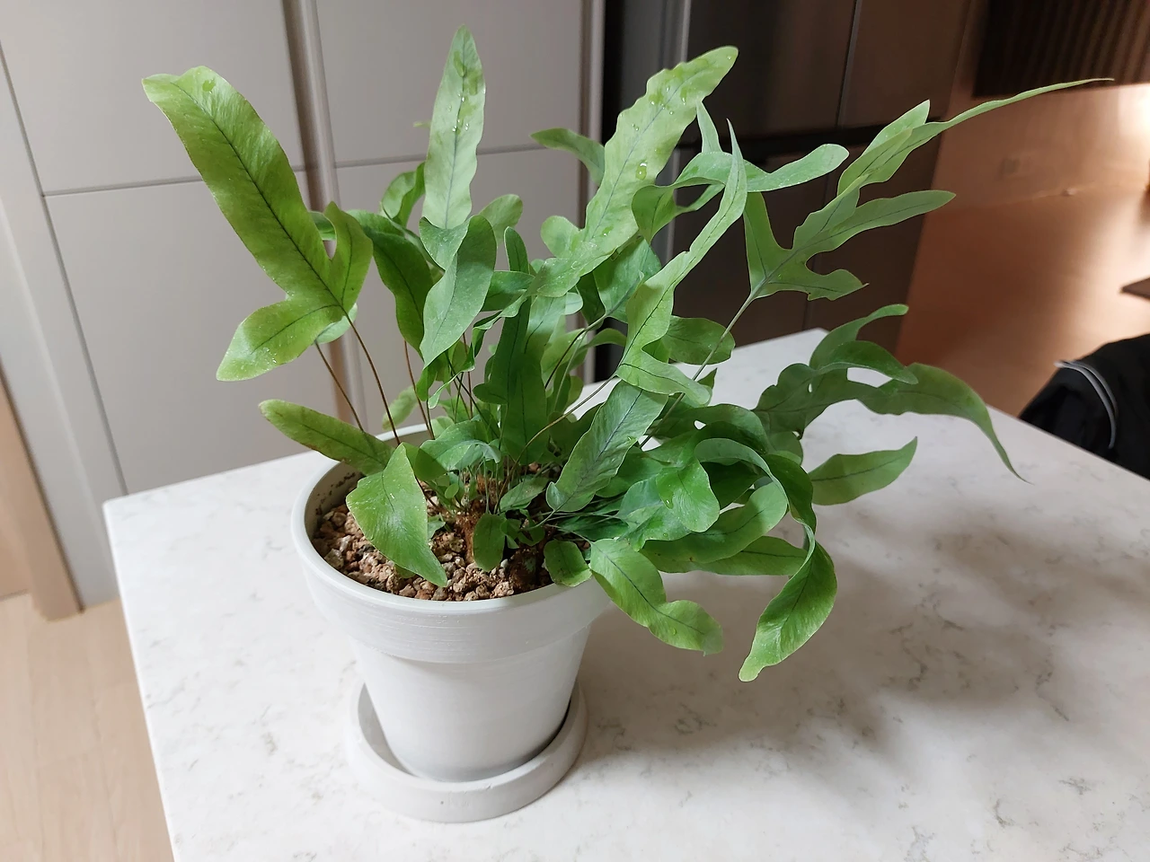 최근에는 블루스타라는 고사리 화분을 들였는데 은회색을 머금은 잎사귀가 너무 매력적이다. 고사리과는 공기 중에 수분이 많고 축축해야 잘 큰다고 했는데, 그런 조건 환경이 딱 맞아떨어지는 곳은 바로 화장실이었다. 하지만 예쁜 식물을 화장실에 두기가 아쉬워서 주방 식탁 위에 가져다 놨다.