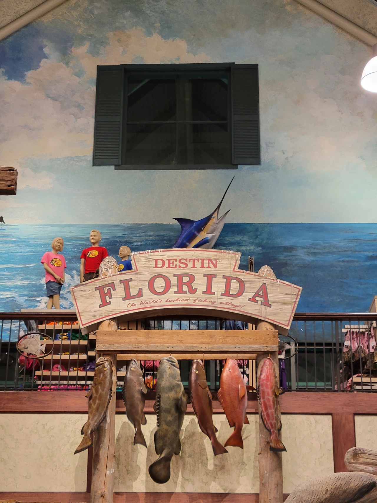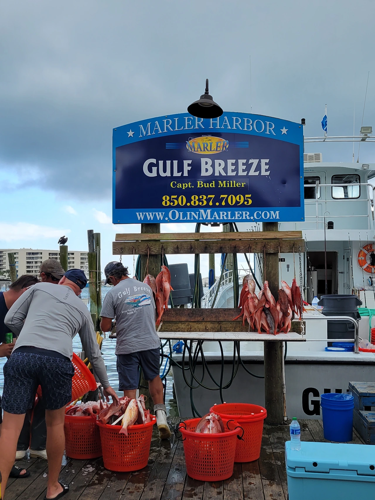 낚시배가 들어온 모습과 이런 어종이 잡힌다며 모형을 달아놓은 곳
