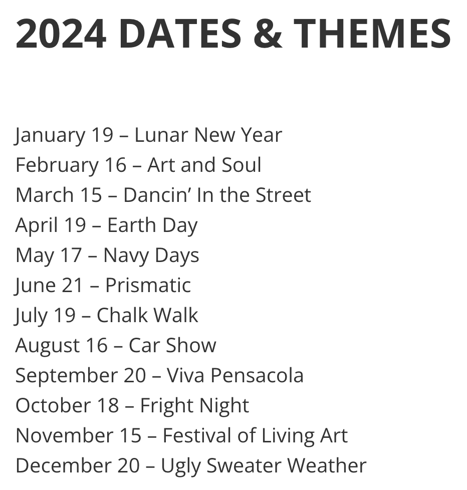 펜사콜라의 대표적인 축제는 매달 셋째 주 금요일에 열리는 갤러리 나잇(Gallery Night)이다. 매달 주제를 달리하며 축제를 연다. 예를 들면 2월은 Lunar New Year가 주제다. 그러면 음력설과 관계된 행사가 열린다. 중국팀에서 용춤을 추고 필리핀 팀에서 전통춤을 추고 퍼레이드 한다. 또 어떤 달은 70년대 복고 스타일을 주제로 잡는다. 그러면 옛날 복고풍 옷과 머리모양을 하고 사람들이 길가에 나온다.