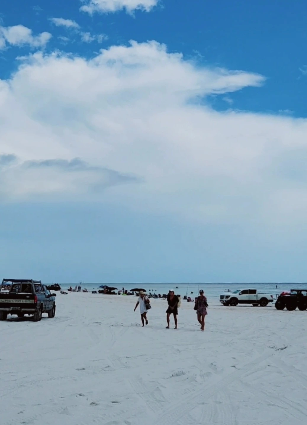 Grayton Beach State Park이라는 이름에서 알 수 있듯이 주립공원옆에는 Grayton Beach가 있다. Grayton Beach는 독특하게도 비치까지 차가 들어갈 수 있다. 보통은 비치뒤로 모래 언덕이 있어서 주차장에 차를 세우고 보드워크를 통해 걸어서 모래밭으로 들어간다(아래 사진 왼쪽처럼). 그런데 여기는 길에서부터 모래언덕 없이 쭉 새하얀 모래밭이다(아래 사진 오른쪽처럼). 자동차로 들어갈 수 있으나 모래가 차에 엄청 끼는 것은 감수해야 한다.