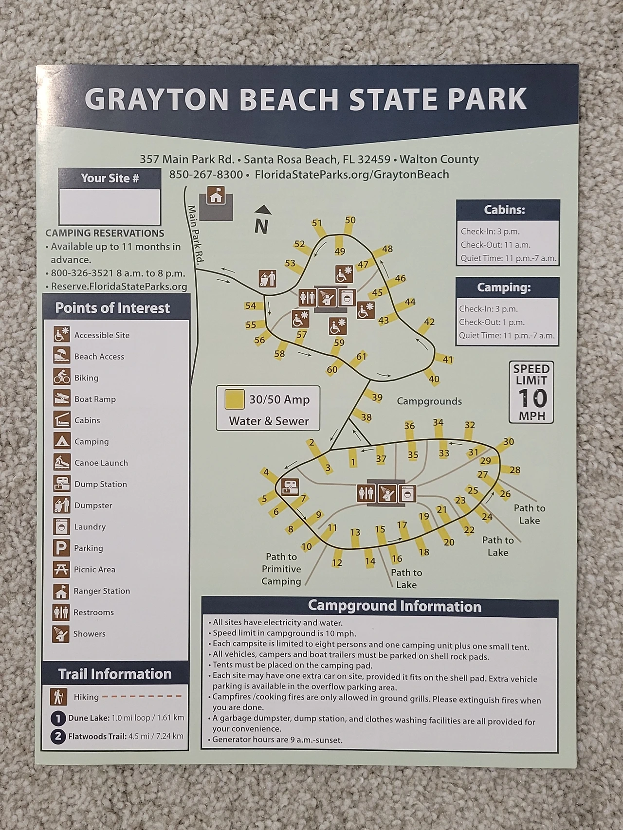 캠프그라운드는 텐트와 RV가 같이 사용하며 지도에서 보는 것처럼 일단 부지가 넓지 않다. 캠프그라운드는 깔끔하고 잘 관리되어 있다. 주립공원 안에는 캠퍼전용 비치가 있고 카약을 유료로 빌릴 수 있다. 비치옆에 있는 주립공원에는 화장실 옆에 코인 세탁기가 건조기가 있다. 물놀이 후 수영복과 비치타월을 해결하라는 뜻이다.