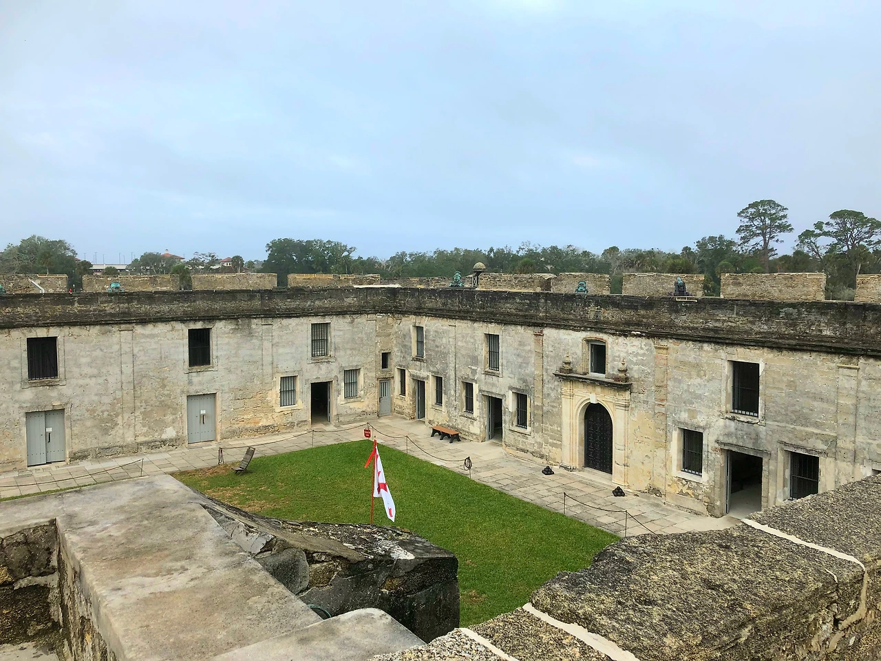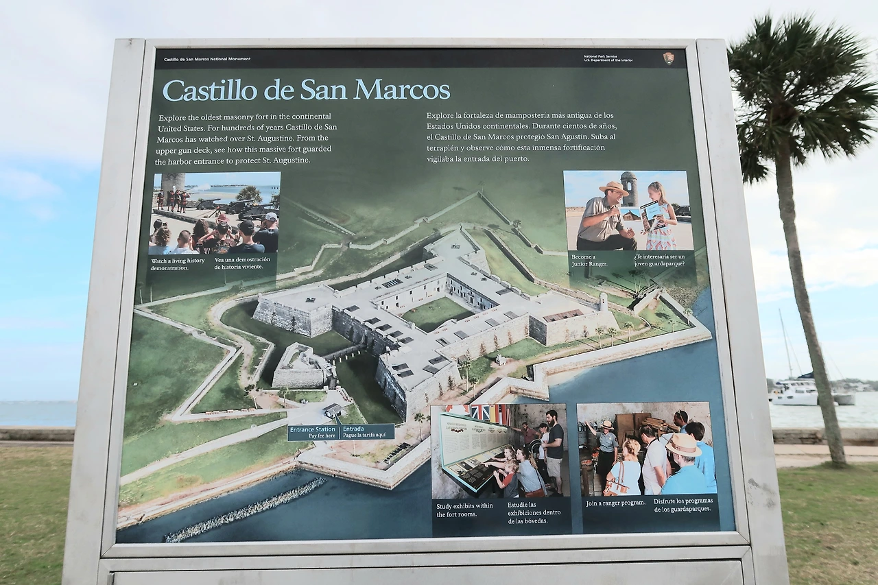 위에서 말한 카스틸로 데 샌마르코스 성채의 주차장에 주차하고 나서면 편하다. 관광지가 대부분 이 성채 주변에 있다. 카스텔로 데 샌 마르코스 성채는 입장료 $15를 내고 들어가야 한다. 들어가면 성채가 버티어 낸 이 지역의 역사가 정리되어 있다. 처음에 스페인 군대가 들어왔다가 영국군이 들어왔다가 스페인 점령지였다가 미국이 되었다. 옛날 군복을 입은 직원이 돌아다니며 관광객과 같이 사진을 찍기도 한다.
