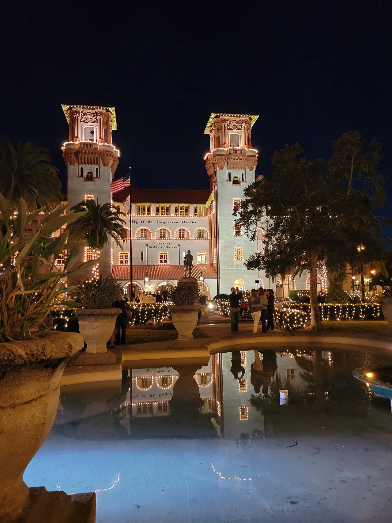 Flagler College의 앞에는 Lightner Museum이 있다. 이 박물관은 Hotel Alcazar안에 위치해 있다. 미국 골동품 박물관으로 입장료는 어른 $19이다. 건물만도 충분히 예뻐서 안에는 안 들어가 보았다. 이 Lightner Museum은 야경도 예쁘다. 연못에 비친 야경을 보면 평행이론처럼 물속에 또 다른 세상이 있을것 같다.