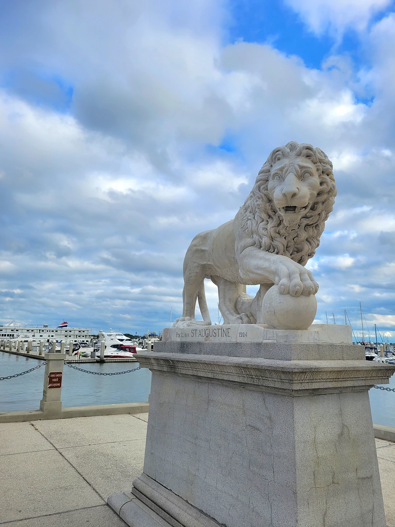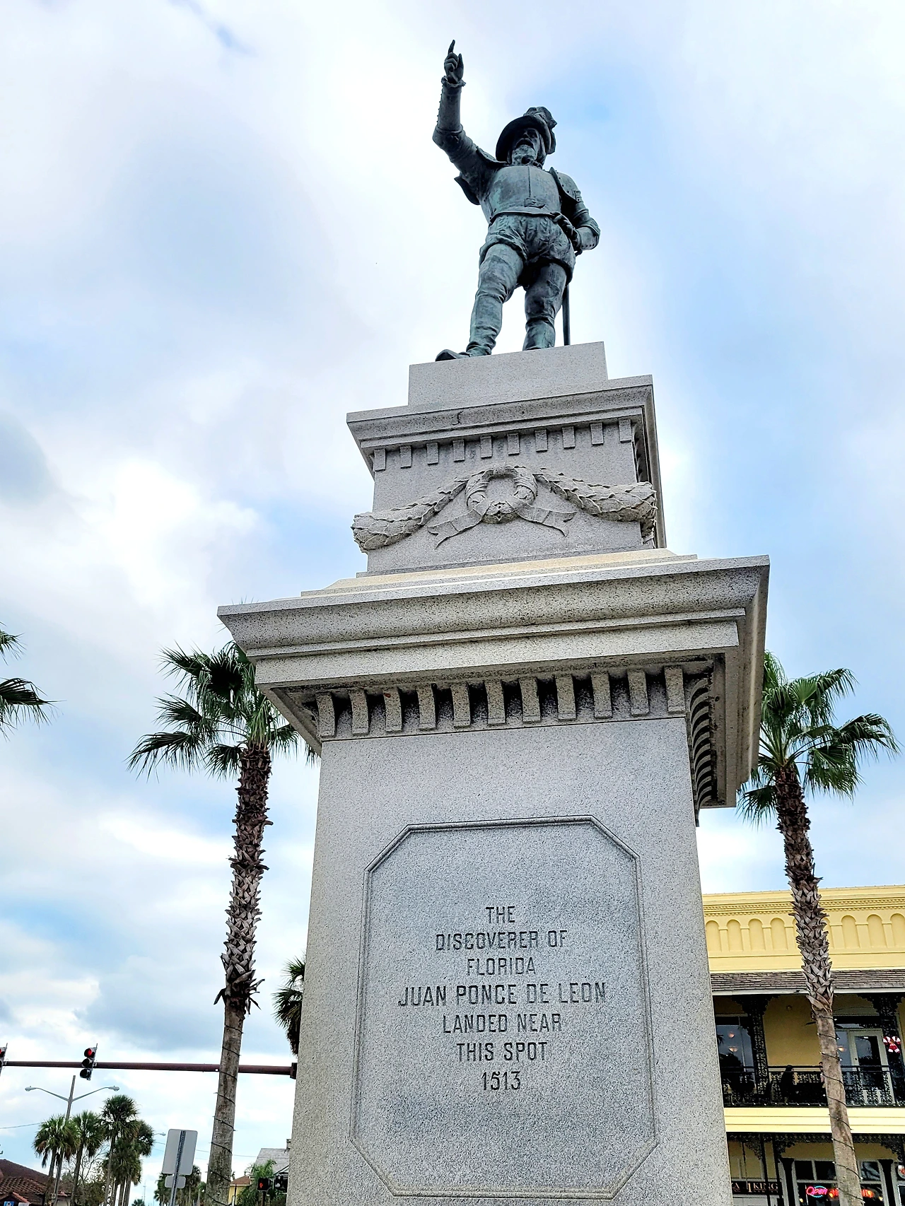 성채를 나와서 입구에 사자 동상이 있는 Bridge of Lions 다리로 가보자. 사자동상옆에는 1513년 경에 플로리다를 발견했다는 폰세 데 레온(Juan Ponce de Leon)의 동상이 있다. 사자동상에서 다리의 반대편을 보면 멀리서도 Flagler College의 멋진 모습이 시선을 끈다. 저기가 어딘지 꼭 가보고 싶어진다.
