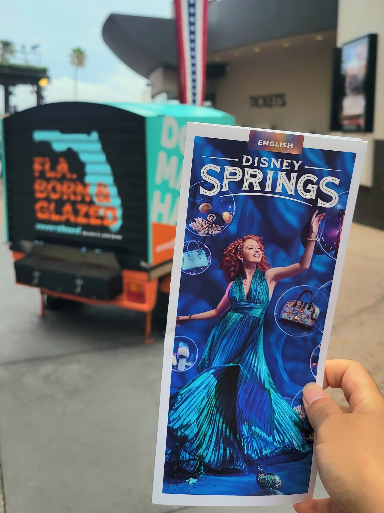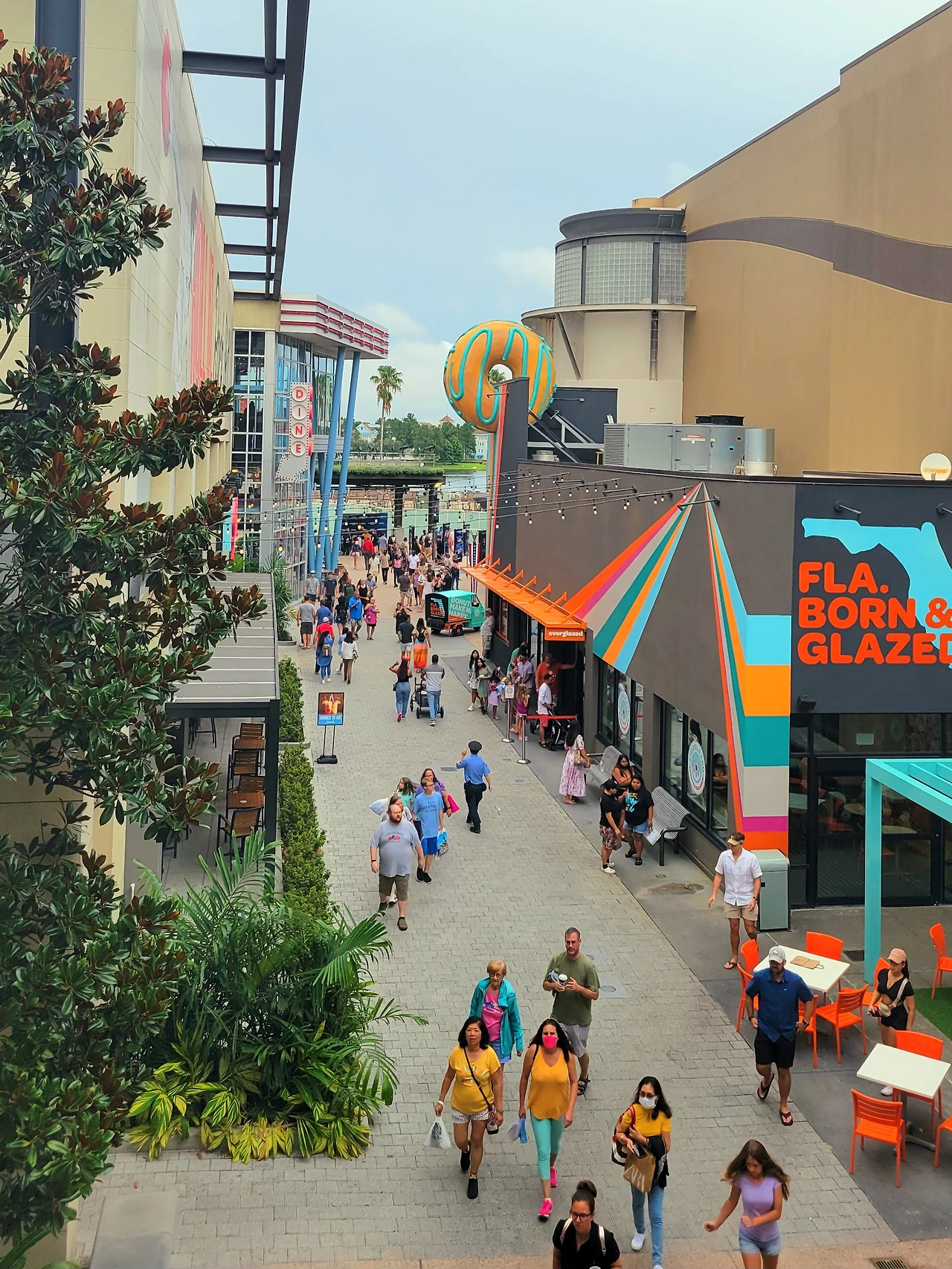 주차타워에 파킹하고 에스컬레이터를 타고 내려가면서 보이는 길거리 모습이다. 알록달록한 길에 사람들이 와글와글하고 활기로 가득 차 있다. 입구에서 디즈니 스프링스 가이드맵을 들었다. 물론 앱으로도 다 볼 수 있지만 여전히 이런 가이드맵을 들고 다니는 게 더 좋다. 이건 놀이공원 갈 때마다 입구에서 가이드맵을 받아 지도를 보며 '어디 갈까' 즐거워하는 나의 오래된 루틴이다. 자기 계발에만 루틴이 있다고 생각했는데 노는데도 루틴이 있었다! 가이드맵 뒤로 보이는 Florida Born Glazed는 도넛집이다. 항상 줄이 서있다. 밤에 돌아오는 길에 줄이 없길래 '이때다!' 싶어 도넛을 사먹었다. 맛은? 도넛맛!
