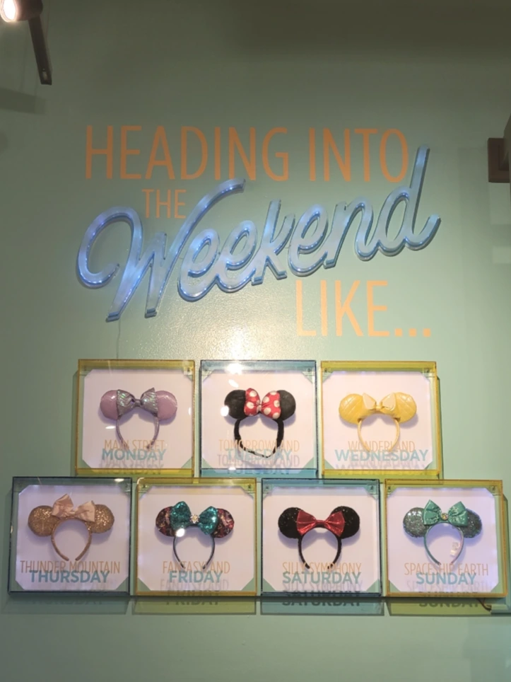 미키 머리띠와 가방 그리고 티셔츠등 기본 기념품을 파는 스토어에 들어갔다. 요일 머리띠를 전시해 놨는데 하나하나 다 예뻤다. 하지만 가격은 이쁘지 않다는 사실! 이 머리띠 하나에 거의 30-35불이다. 그런데 머리띠의 다양함이 어마어마하다. 그럼에도 계속 신제품이 출시되고 있다.