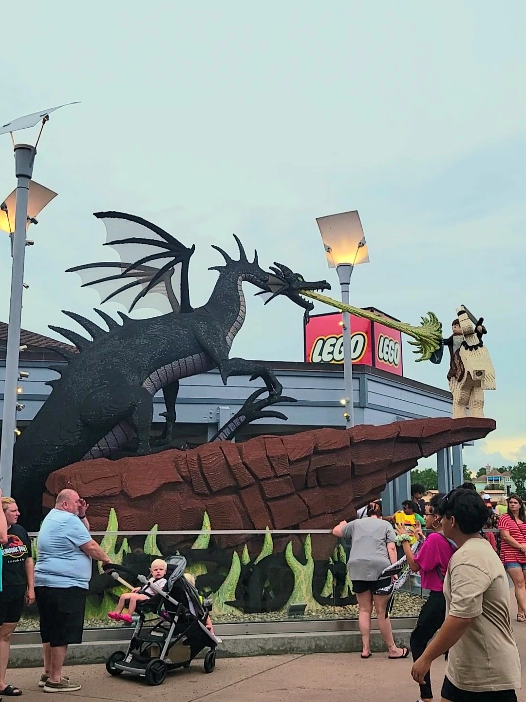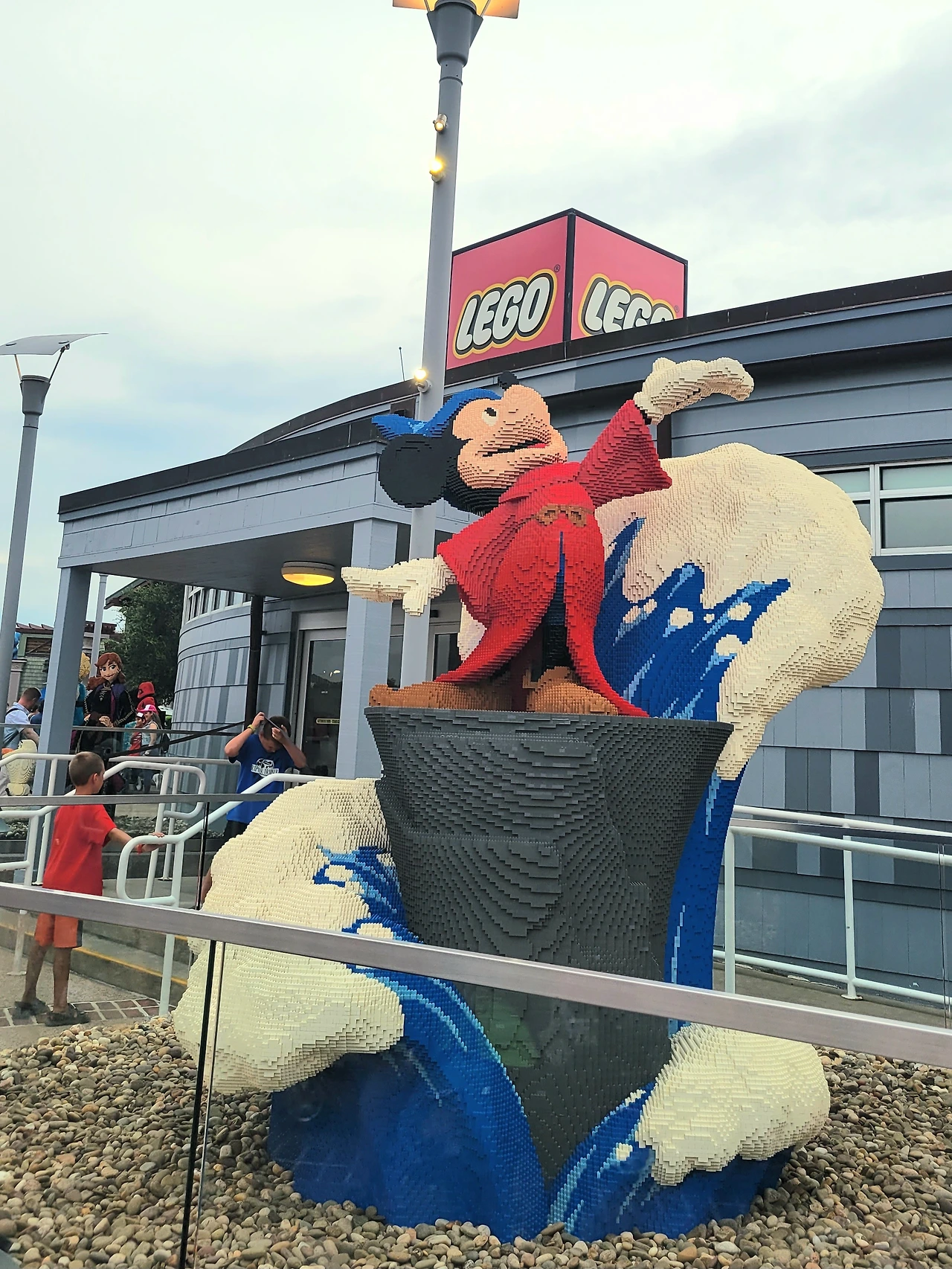지도를 펼쳐보면 오렌지주차장이 보이고 왼쪽으로는 레스토랑이 보인다. 기구가 있는 쪽으로 가는 메인 스트리트가 가장 붐비는 곳이다. 기구를 지나면 작은 섬이 있고 그 안에 레스토랑이 더 있다. 그 섬의 바깥쪽은 쇼핑가다. 백화점에서 볼 수 있는 브랜드들이 거의 다 있다. 슬슬 다니다가 만난 레고샵! 여긴 정말 '작품'이 전시된 곳이다. 이걸 사람이 만들었단 말인가! 감탄을 하며 한참을 보았다. 불을 뿜는 용과 싸우는 기사뿐 아니라 겨울왕국의 안나와 엘사까지 사람크기로 너무나 정교하게 레고로 만들었다. 정말 대단하다!