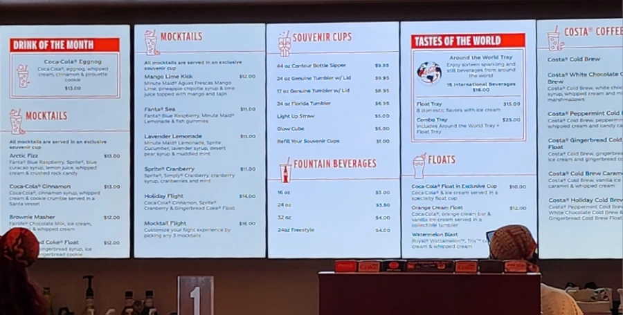 루프탑에서 밖을 보는 모습은 좋았는데 루프탑 위는 사람이 많았다. 메뉴판을 보니 원가 이것저것 많다. 특이한 것은 Mocktail! 여러 술을 섞어서 칵테일을 만드는 것처럼 여러 음료수를 섞어서 만든 알코올 없는 음료수가 목테일이다. 코카콜라샵의 추천음료는 'Tastes of the world'다. 이름처럼 여러 나라의 코카콜라를 샘플러로 파는 것이다. 열여섯 나라의 코카콜라를 한 트레이에 올려서 파는 것이 16불, 여덟 나라의 코카콜라 위에 아이스크림을 띄워준 것이 15불이다.