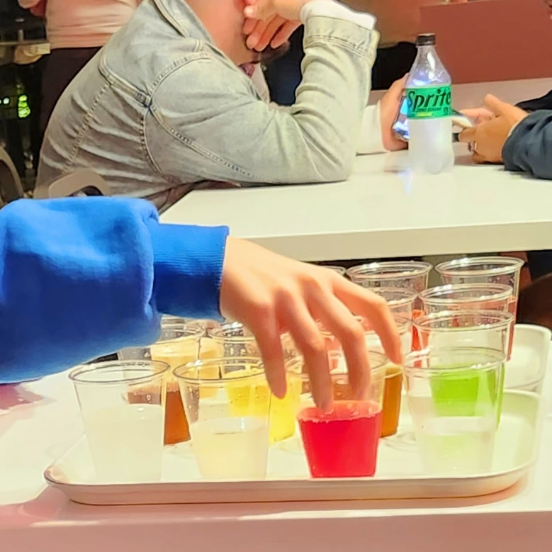 옆자리에서 Tastes of the world를 주문했다. 여러 알록달록한 색의 코카콜라가 16개의 컵에 담겨 나온다. 어디서 이렇게 여러 나라의 코카콜라맛을 비교하며 즐길 수 있을까? 확실히 차별성 있고 재미있으니 사람들이 많이 찾는다. 보고 있으니 코카콜라에 이렇게 색이 다양했나 하는 의문이 든다. 인생을 살아오며 만난 대부분의 코카콜라색은 갈색이다. 사이다같이 투명한 색도 암바사같이 흰색도 이상하지만 체리색이며 특히 연두색은 뭐니? 정말 코카톨라 맞니? 싶다.