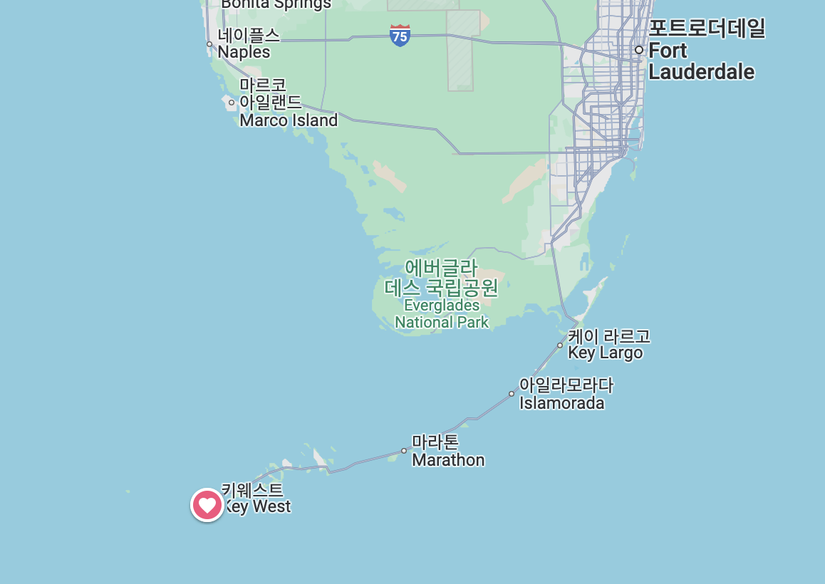 마이애미에서 미국의 최남단인 키웨스트까지는 편도로 3시간 40분이 걸린다. 키웨스트 까지 가는 길에 키 라르고와 이슬라 모라다 같은 섬들을 거친다.