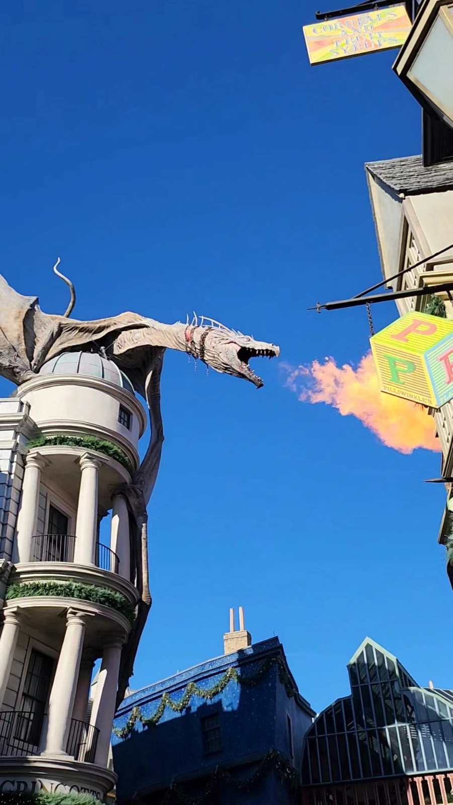 해리 포터가 해그리드와 함께 처음으로 다이애건 앨리에 왔을 때처럼 설레는 마음으로 다이애건 앨리에 들어섰다. 그린고트 은행 위에 있는 용이 여전히 불을 뿜으며 우리는 반긴다. 이 용이 불을 뿜기 전에 뭔가 소리가 난다. '나 곧 불뿜는다. 준비해~'하는 것처럼 요란한 우르릉 소리가 난 후 위의 사진처럼 불을 뿜는다. 전에는 불을 꽤 오래 뿜었었는데 이번에는 절약모드로 들어갔는지 불을 아주 잠깐 뿜었다.