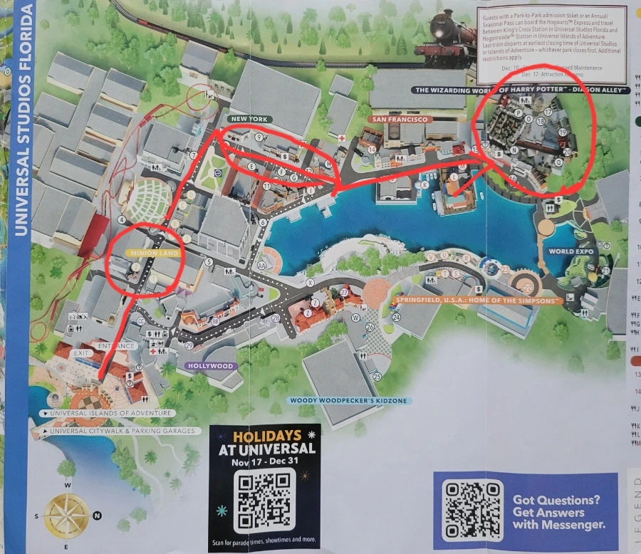 두 번째로 예약란 레스토랑은 유니버설 스튜디오에 있는 '미니온 카페'다. 이번에 미니온 랜드에 새로 생긴 카페다. 위에 유니버설 스튜디오 지도를 보면 입구에서 만나는 처음 동그라미가 미니온 랜드다. 첫날에 아일랜드 오브 어드밴쳐에서 점심 먹고 유니버설 스튜디오로 건너왔다면, 그다음 날은 유니버설 스튜디오 미니온 카페에서 점심 먹고 아일랜드 오브 어드밴쳐로 건너갔다. 지도를 보면 처음 부분이 미니온 랜드, 중간에 있는 긴 동그라미 지역은 길거리 공연이 많은 지역이고, 마지막 동그라미가 다이애건 앨리(Diagon Ally)다.