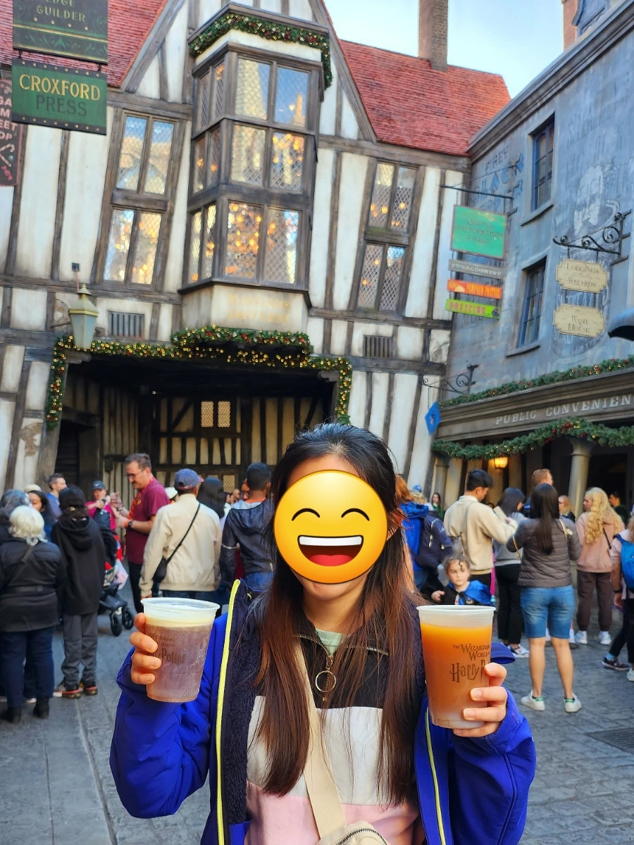 해리포터 월드에 왔다면 적어도! 버터비어 와 펌킨주스는 먹어줘야 한다. 버터비어는 비어가 아니고 표면에 부드러운 크림이 있는 음료수다. 음료자체는 약간 쌉쌀한 맛이 난다. 마실 때마다 느끼는 건데 이 음료는 정말 잘 만들었다. 완전 내 취향이다. 그런데 나만 그런 건 아닌가 보다. 우리 가족 모두 버터비어가 맛있다며 난리였다. 유니버설 밖에서도 팔면 엄청 사 마실 것 같다. 그리고 펌킨 주스는 뭔가 살짝 수정과가 생각나는 맛이다. 음료매장은 다이애건 앨리가 호그스미드보다 좀 덜 붐빈다. 호그스미드에서 줄이 길어 버터비어를 포기했다면 다이애건 앨리에서는 가능하다.