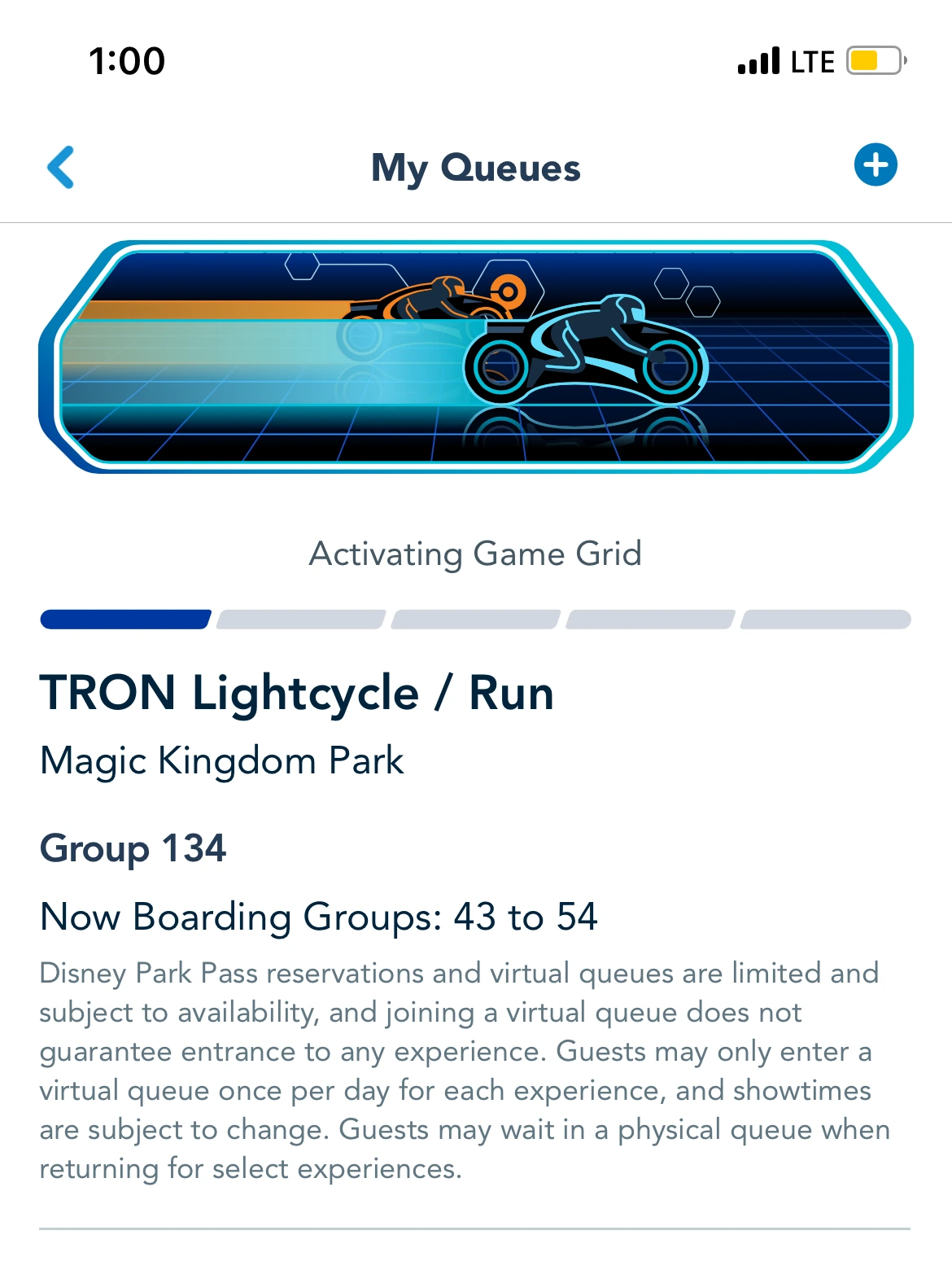 이 신상 라이드는 무조건 줄을 선다고 탈수 있는게 아니다. 디즈니 앱에 있는 Virtual Queue에 신청을 해야 한다. 만약 트론을 오늘 타려면, 타는 날 아침 6시에 신청 폼이 열렸을때 들어가서 수강신청할때처럼 신청을 해야한다. 성공하면 시간 배정을 받는다. 우리도 새벽 6시에 딸내미가 일어나서 신청을 했는데 떨어졌다. 그러나 실망은 아직 아르다. 낮 1시에 다시 신청할 기회가 있다.