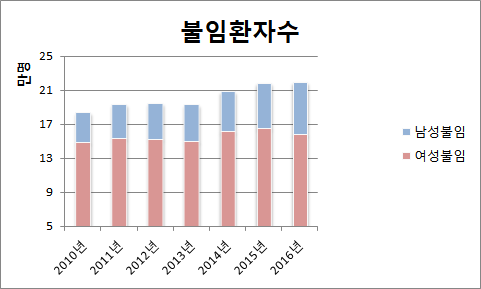 건강보험심사평가원 자료에 의하면 남성 난임의 수는 2010년 34,811명에서 2016년 61,903명으로 증가하였으며, 여성의 난임의 수는 148,436명에서 157,207명으로 증가하였습니다. 2016년도에 출산한 아기수가 406,000명인 것을 고려하면 적지 않은 숫자입니다.