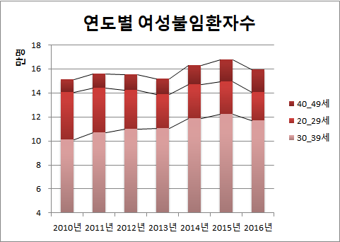 그리고 2010년-2016년의 자료에 의하면 난임으로 진단된 가장 많은 연령대는 30대였으며, 30대와 40대 난임환자의 증가하는 추세가 관찰되었습니다. 이는 30-40대의 결혼이 증가하고 20대에 결혼하는 사람이 줄어든 것이 반영되었기 때문이 아닐까 생각합니다.
