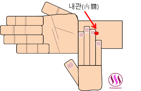 손바닥 끝에서부터 손가락 3개 내려온 곳에 내관(內關, P6)이라는 지압점이 있는데, 그곳을 눌러 주는 것이 근거가 확실치는 않지만 효과가 있는 것으로 알려져 있습니다.