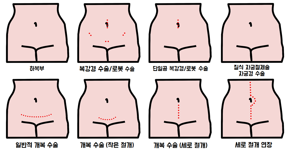 자궁근종의 크기, 이전 흉터의 위치 및 모습 등을 고려해서 '절개법'을 결정하게 되고 절개법에 따라서 피부에 생기는 흉터가 달라지게 됩니다.