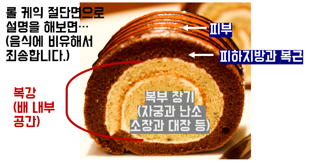 피부를 나이프(메스)로 절개하여 복부장기에 대한 수술을 시행하는 것이죠. 롤케익에 비유하면 갈색부분(피부)을 칼로 잘라서 안쪽에 있는 노란부분(복부장기)을 수술하는 것을 의미합니다.