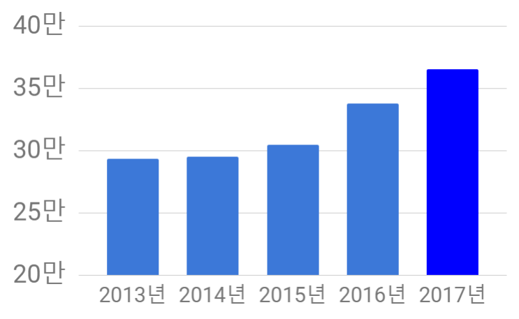 우리나라 심평원 자료를 살펴보면, 자궁근종으로 진료를 보는 환자의 수는 2013년 이후로 지속적으로 증가하고 있는 상태입니다. 그리고 작년 한 해 동안 자궁근종으로 진료받고 치료받았던 환자는 36만 5천 명 정도입니다. 나이 불문 2600만 여성 중 36.5만 명 정도로 1.4%의 여성이 자궁근종으로 인해 진료 혹은 치료가 필요했던 것입니다.