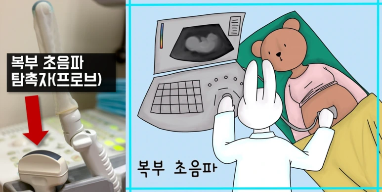 복부 초음파 : 복부에 프로브를 닿게 하여 보는 방법. 복부를 통해서 골반 내부(자궁, 난소, 나팔관 등)를 살펴봅니다.