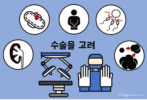 '몸에 칼을 댄다'라고 표현할 만큼 수술은 가능한 안 할 수 있으면 좋겠죠. 미용 성형처럼 예뻐지는 것도 아니고, 몸에 흉터만 생기고 수술 후에 배 안에는 유착이 생기니깐 꼭 필요한 경우에만 하는 게 좋지 않을까요? 그렇기 때문에 증상이 없는 자궁근종은 수술하지 않는 것을 일반적인 원칙으로 삼습니다. 다른 치료에 효과가 없는 경우, 크기가 커지는 경우, 철 결핍성 빈혈로부터 회복이 되지 않는 경우, 질 출혈 등의 증상이 지속되고 일상생활이 힘든 경우, '다른 치료방법'이 마땅치 않거나 수술적 치료가 가장 효과적인 경우에도 수술이 필요합니다.