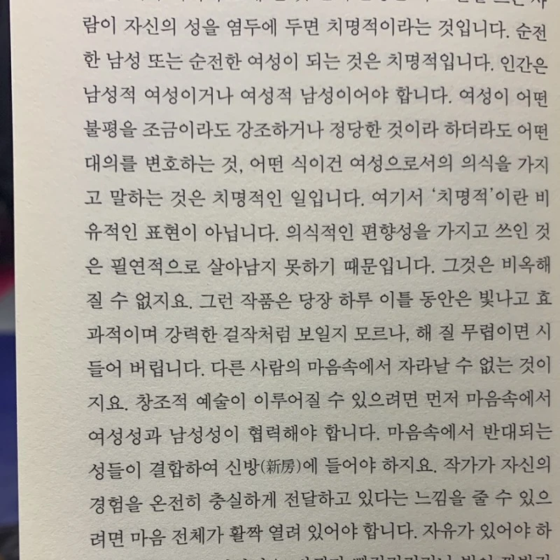 그 길고 무수한 여성 차별의 역사를 부정해서가 아니라 그 분노에 치우치고 성별을 대립적으로 의식할때 자신은 그 자신이 될 수 없기 때문이다. 그런 상태로는 좋은 글을 쓸 수 없기 때문이다.