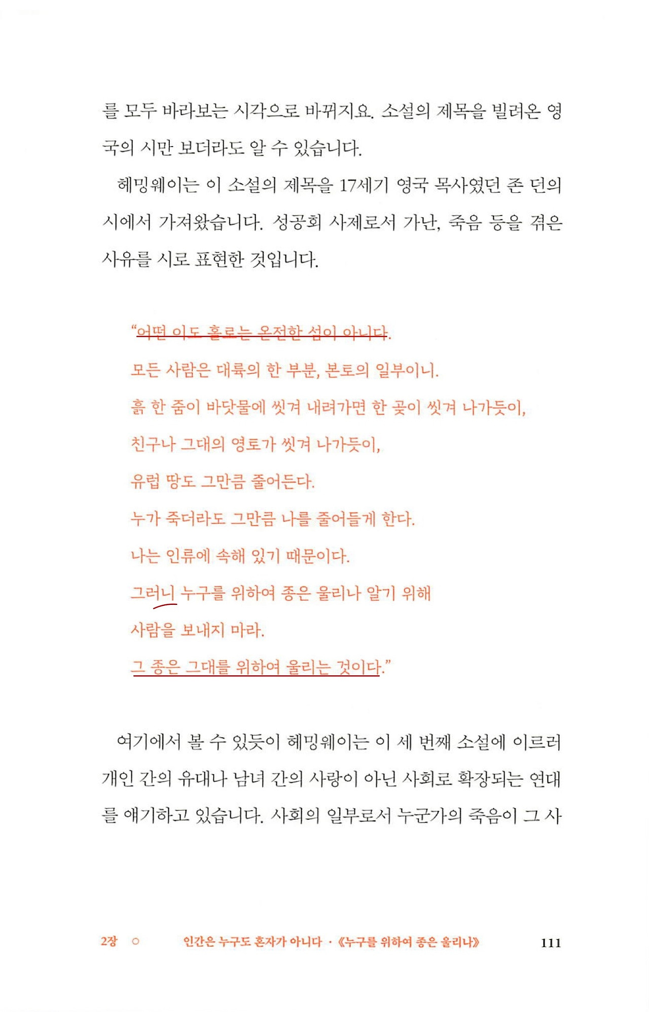 -> “어떤 이도 홀로는 온전한 섬이 아니다. 그 종은 그대를 위하여 울리는 것이다.”(p111)