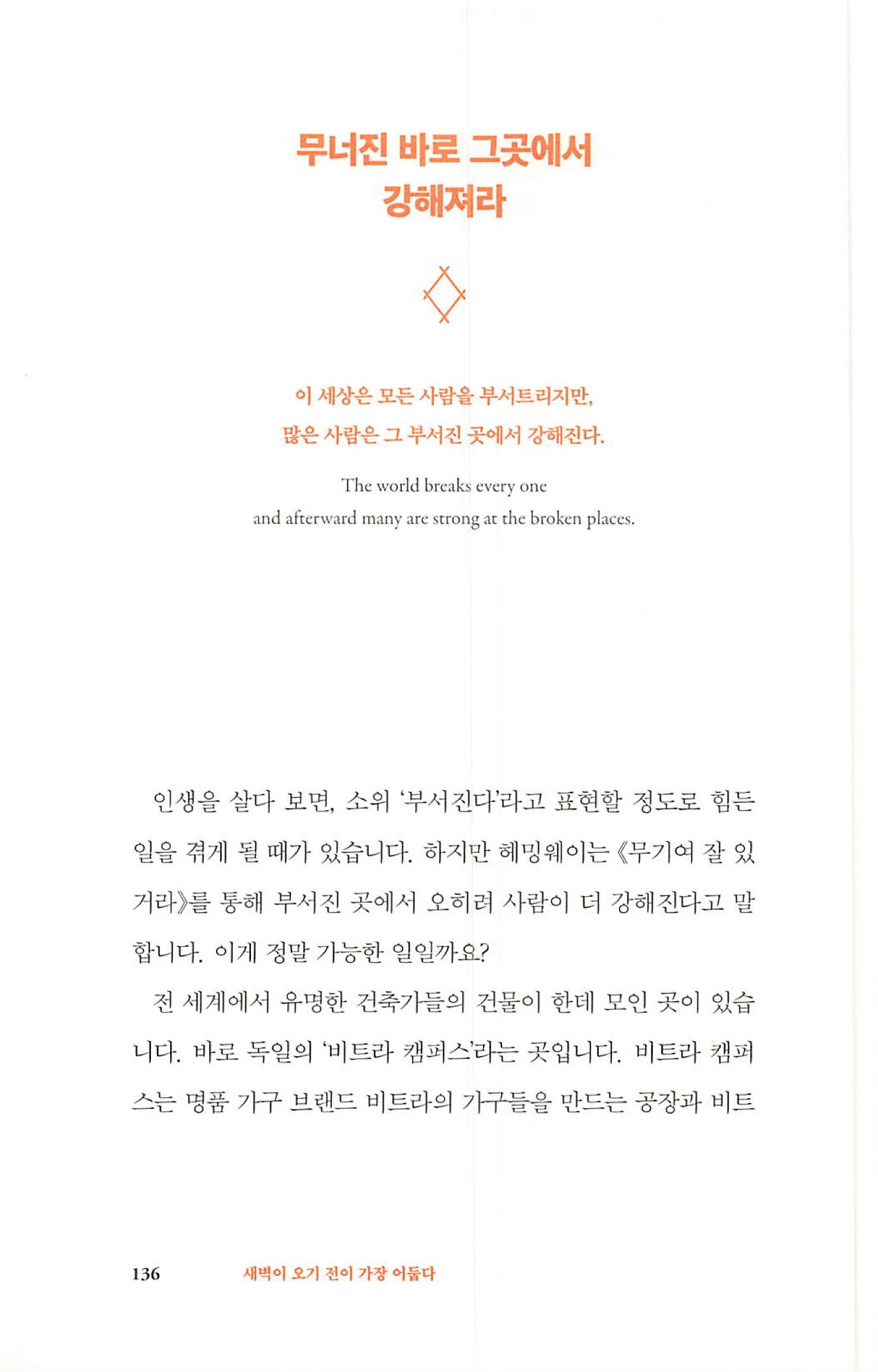 -> “이 세상은 모든 사람을 부서뜨리지만, 많은 사람은 그 부서진 곳에서 강해진다.”(p136)