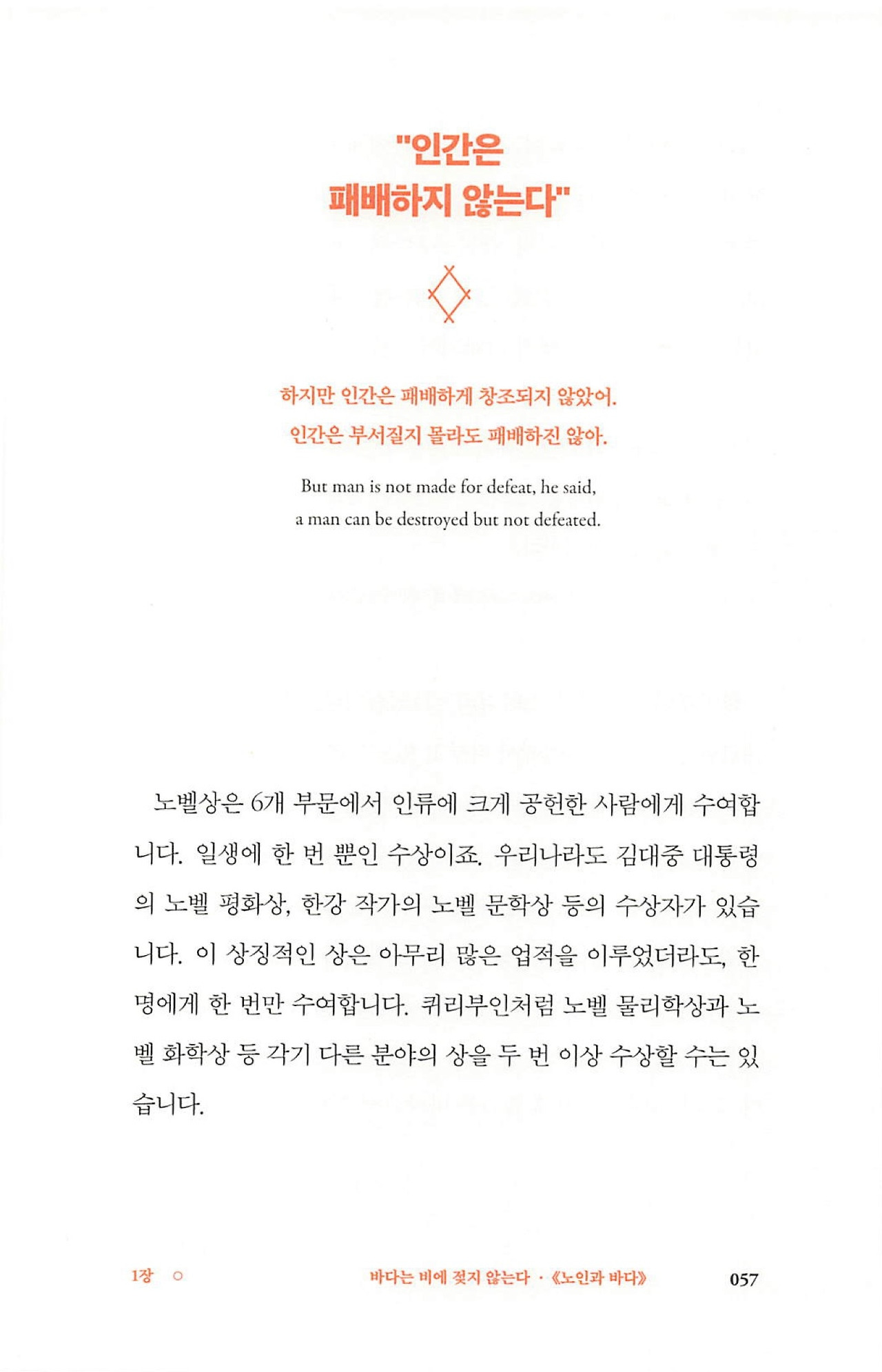 -> “인간은 패배하게 창조되지 않았어. 인간은 부서질지 몰라도 패배하진 않아.”(p57)