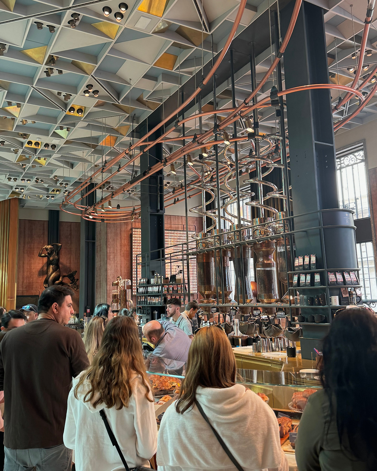 . 그래서 스타벅스는 정면 승부 대신, 전 세계 2곳 밖에 없었던 리저브 로스터리라는 가장 프리미엄 한 카드를 내밀었다. 밀라노 대성당 근처의 중심지에 거대한 커피 극장을 만드는 경험형 공간을 택한 것이다. 이곳에서는 커피가 음료가 아니라 하나의 여정처럼 설계되어 있었다.