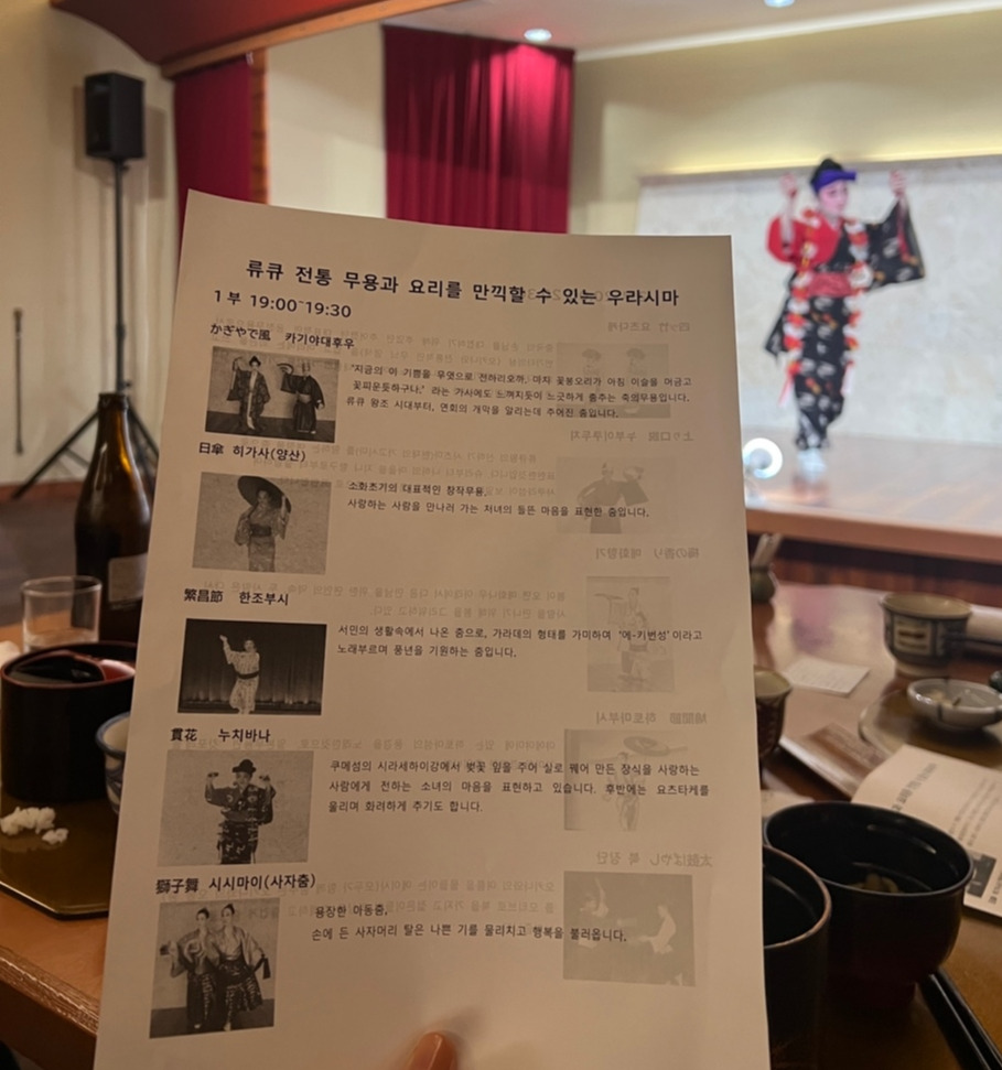 그래도 시간이 남아서 식당에 예약시간보다 한 시간이나 일찍 갔다. 이 식당은 오키나와 전통 음식을 하는 식당이라고 한다. 앞에는 오키나와 전통춤을 공연하는 무대가 있었다. 공연은 7시와 8시에 각 30분씩 두 차례 하는데, 식당에 일찍 와서 음식도 다 먹은 데다 피곤하기도 해서 두 번째 공연은 못 보고 7시 공연만 보았다.