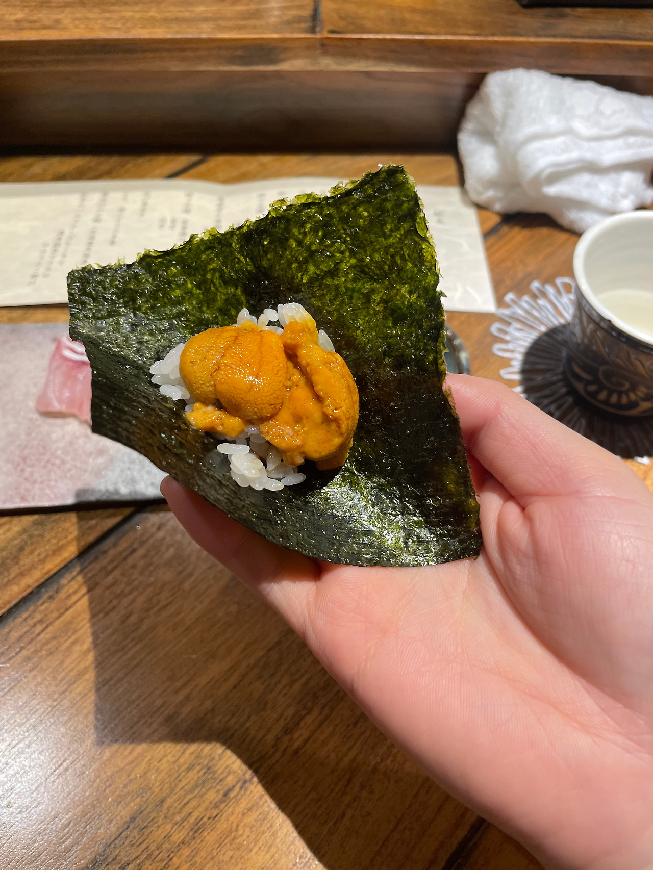 문제는 우니 초밥 하나가 2000엔, 한화로 거의 2만 원이었다는 것이다. 세상에, 그거 하나가 2만 원이라니 값을 알았으면 굳이 안 먹었을 텐데, 설마 그 정도로 비싸겠나 하는 안이한 생각으로 예산을 초과했다. 굴까지 먹었으면 18000엔이 될 뻔했다. 그러면서 알게 된 사실은, 18000엔짜리는 14000엔짜리보다 음식이 두 가지 더 나온다는 것이었다.
