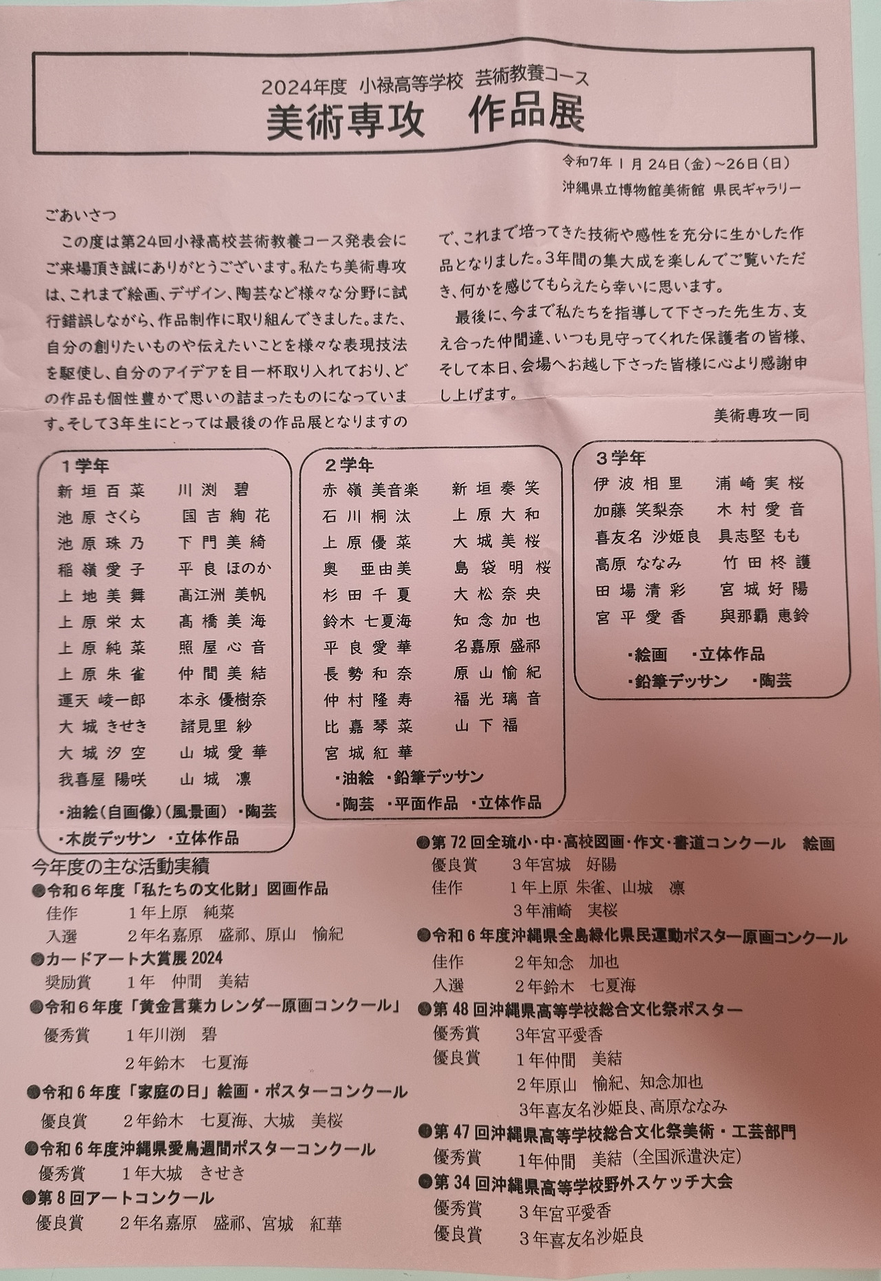 1층을 다시 둘러보다 특이한 것을 발견했다. 1층에는 사무 공간과 작은 전시실이 있는데 그 전시실에는 오키나와 주민과 학생의 작품이 전시되어 있고 학생들이 방문객을 맞이하고 있었다. 현립 미술관에 일반인 작품을 전시하다니 인상 깊었다. 우리로 말하면, 시립미술관에 학생과 주민 같은 아마추어 작품을 전시한 적이 있을까? 앞으로도 그럴 일은 별로 없을 것 같다.