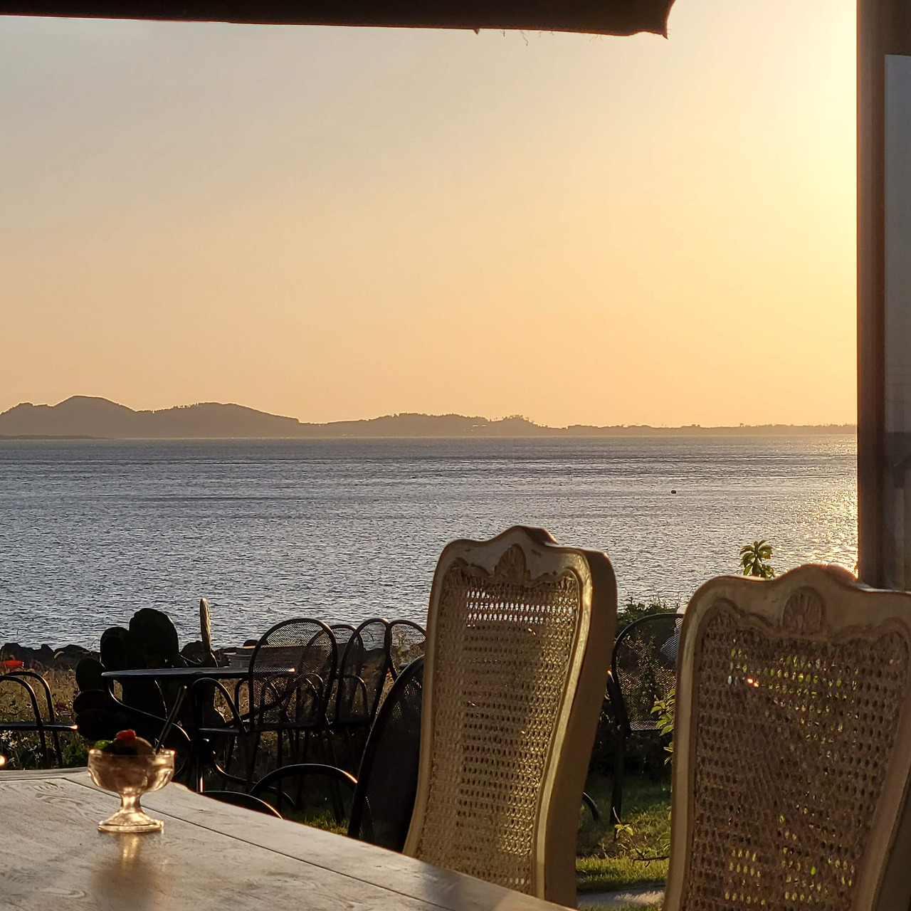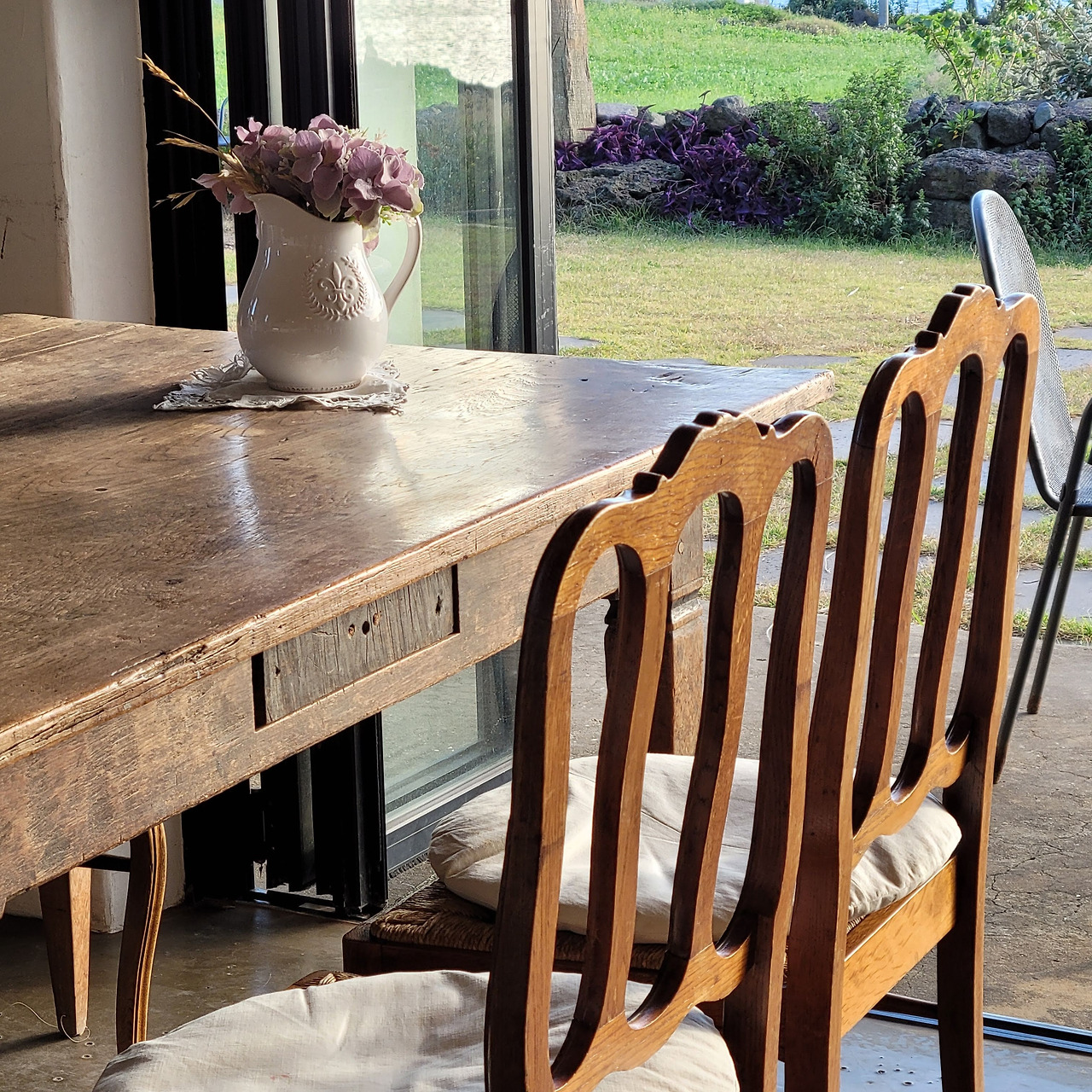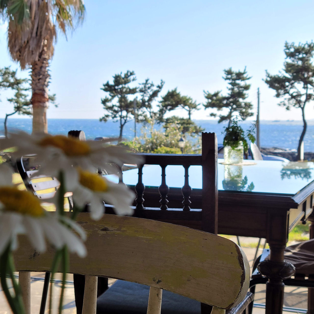 카페에 오래 있을 작정으로 음료 한 잔과 디저트 한 개를 주문했다. 쑥떡에 아이스크림이 곁들여진 달달함. 유명 떡집은 찾아가서 먹을 정도로(그래 봐야 두 곳이지만) 떡을 좋아하는 나로서는 아주 반가운 조합이었다. 한 접시 깔끔하게 끝내고 더욱 반짝거리는 눈으로 주위를 탐색했다. 화병마다 꽂혀있는 다채로운 꽃들, 엔틱 한 가구, 나무 사이로 부는 바람소리, 가구들을 지나 보이는 바닷가. 카페 안의 모든 것이 자신의 매력을 아지랑이 피워내듯 일렁거리며 피워내고 있었다. 이런 곳이라면 일주일 동안 매일도 올 수 있을 것 같았다. 실제로 그 날 이후 두 번더 방문했고 나머지 두 번은 처음 갔을 때만큼 날씨가 좋지 않아 처음 보았던 카페의 이곳저곳의 매력을 제대로 느끼지 못했다.